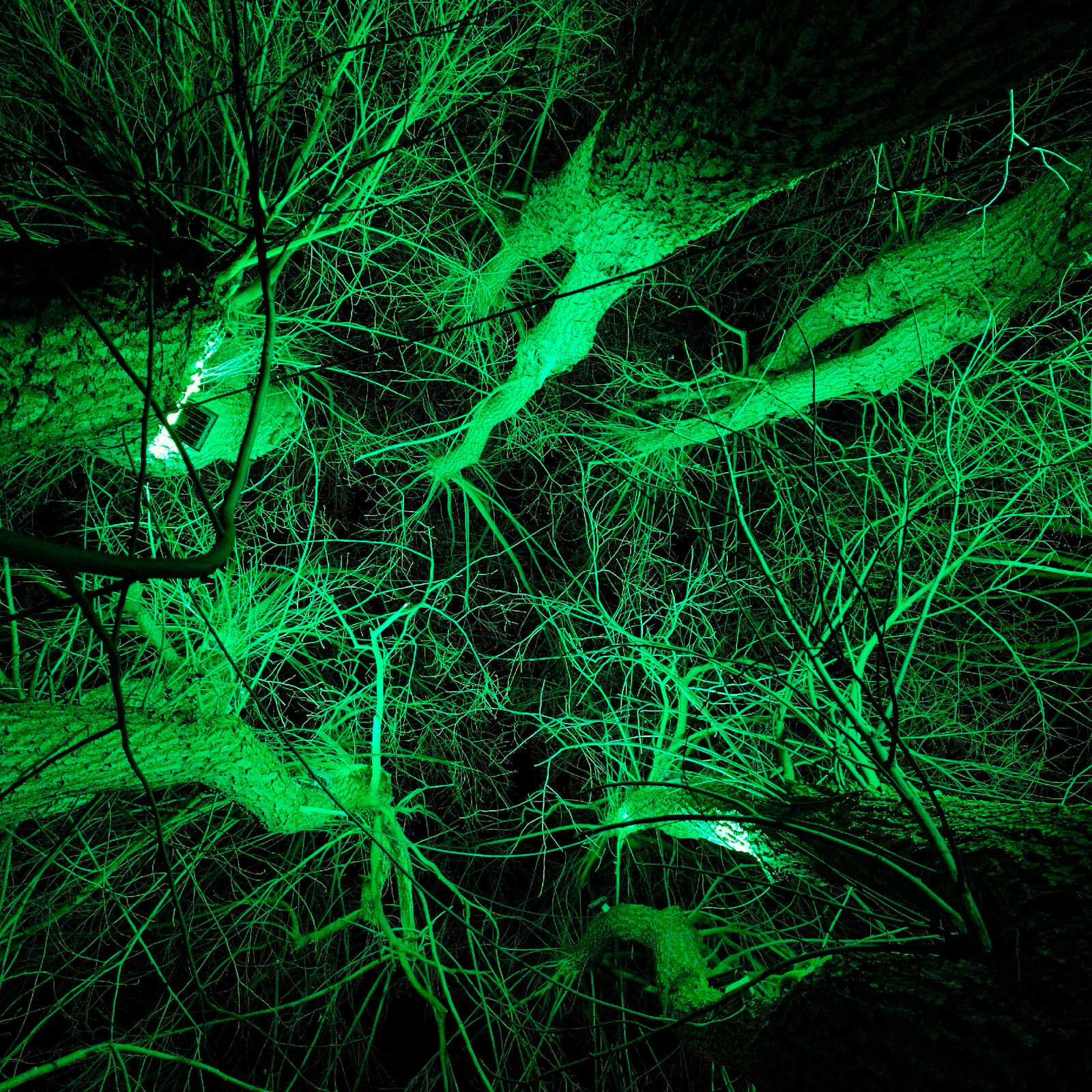 The image shows a low-angle view of tree branches and trunks against a dark night sky. The trees are illuminated with a strong green light, giving them an eerie and unnatural appearance. The branches…read more