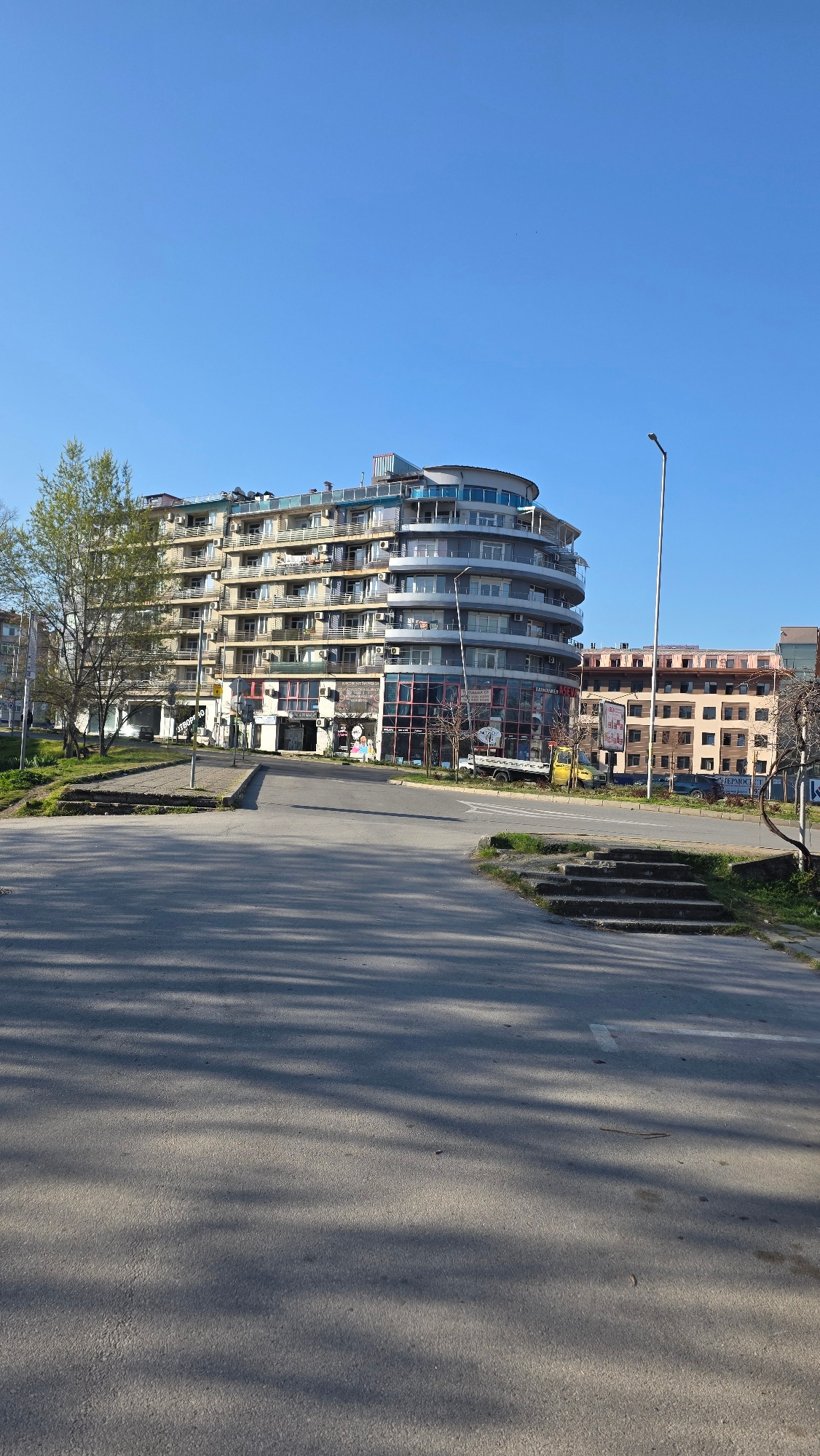 The image captures an urban scene in Blagoevgrad, Bulgaria, showcasing a distinctive curved apartment building with multiple balconies and glass panels. The building appears to be several stories high…read more