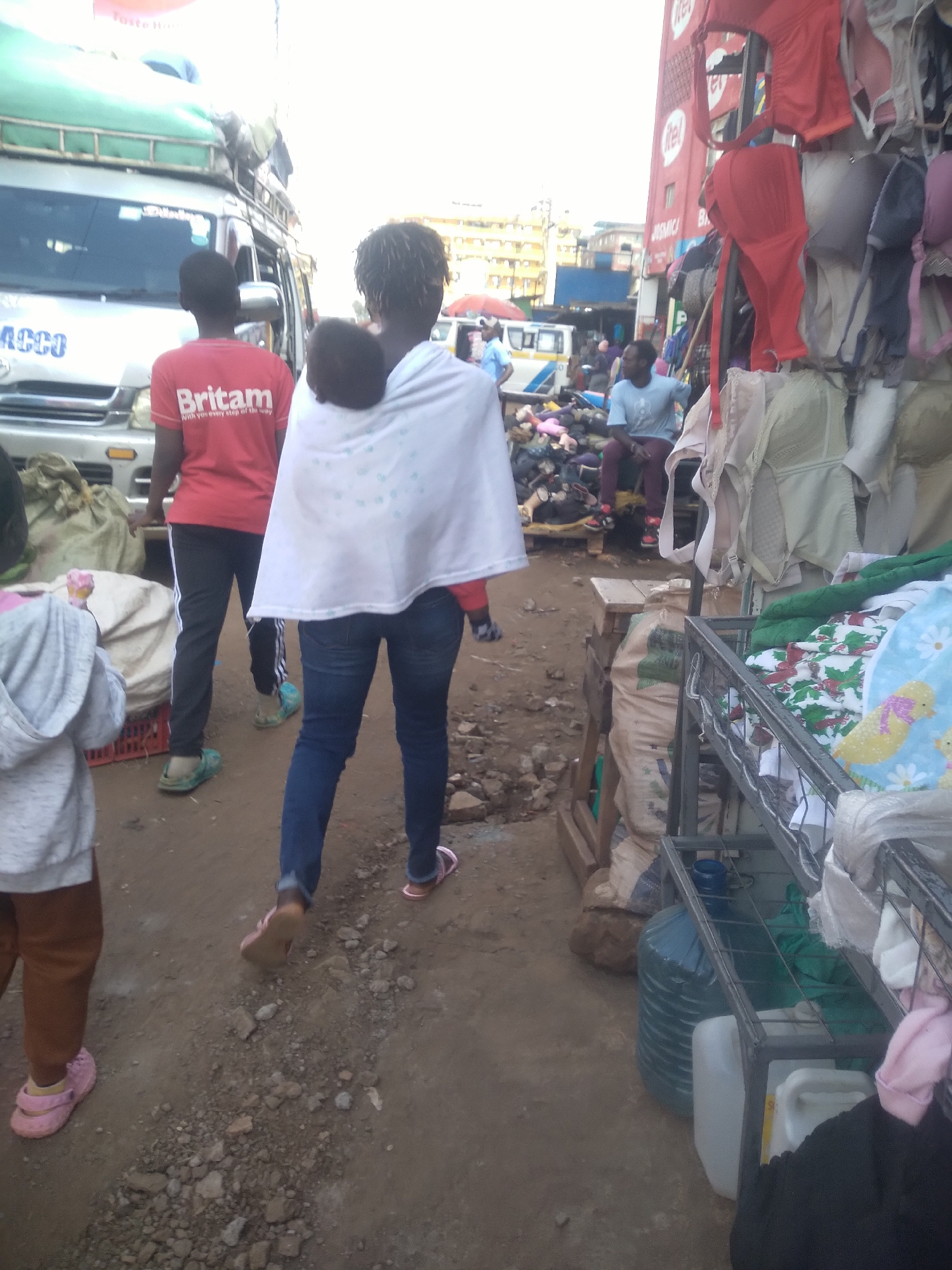 The image shows a street scene in Nyeri, Kenya. Several people are present, including a woman carrying a child on her back, a person wearing a red shirt with the word "Britam," and another individual…read more