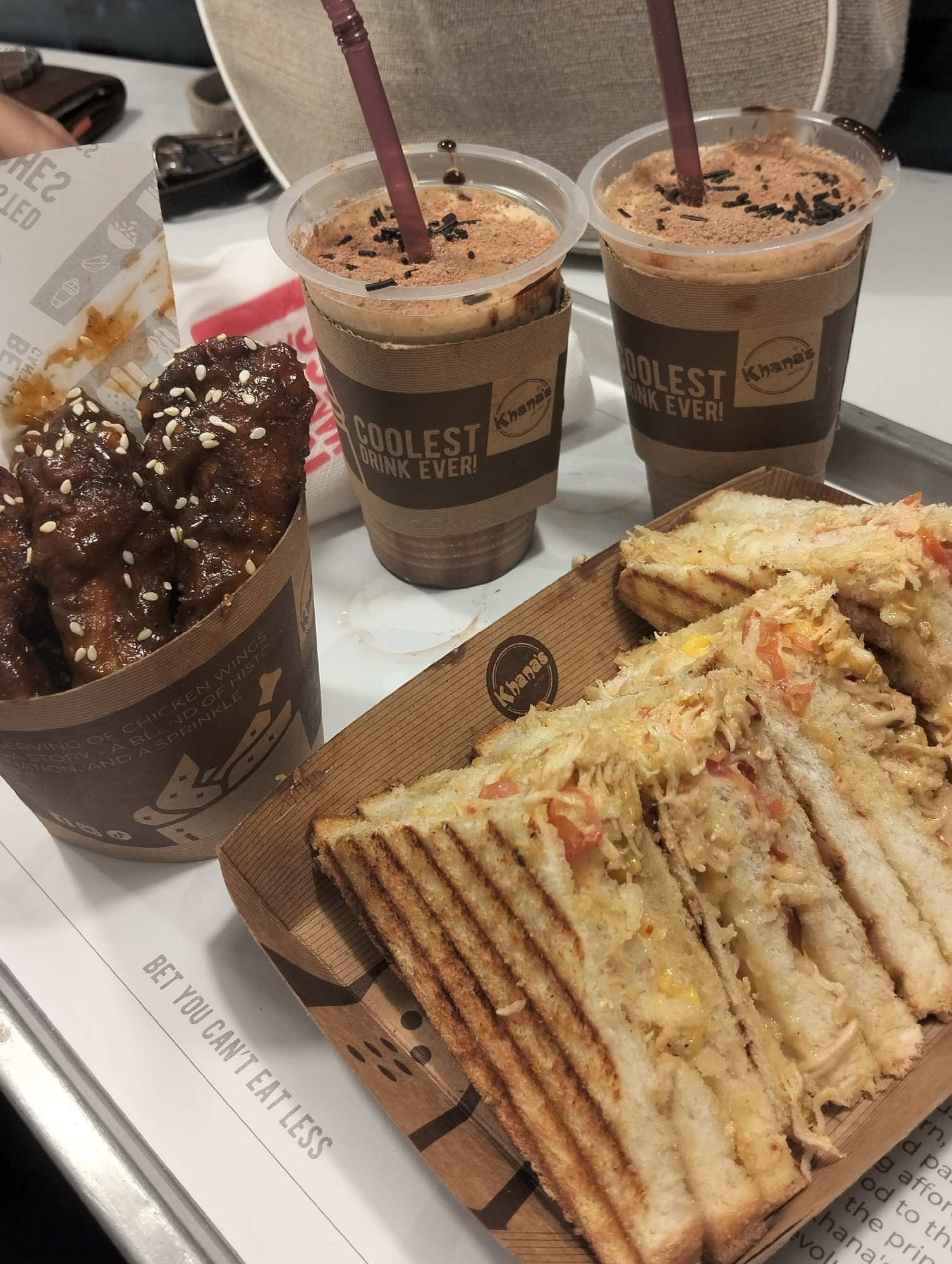This image captures a close-up, indoor shot of a meal from Khana's, a food establishment located in Dhaka, Bangladesh. The scene is set on a white table or counter, with food and drinks presented on a…read more