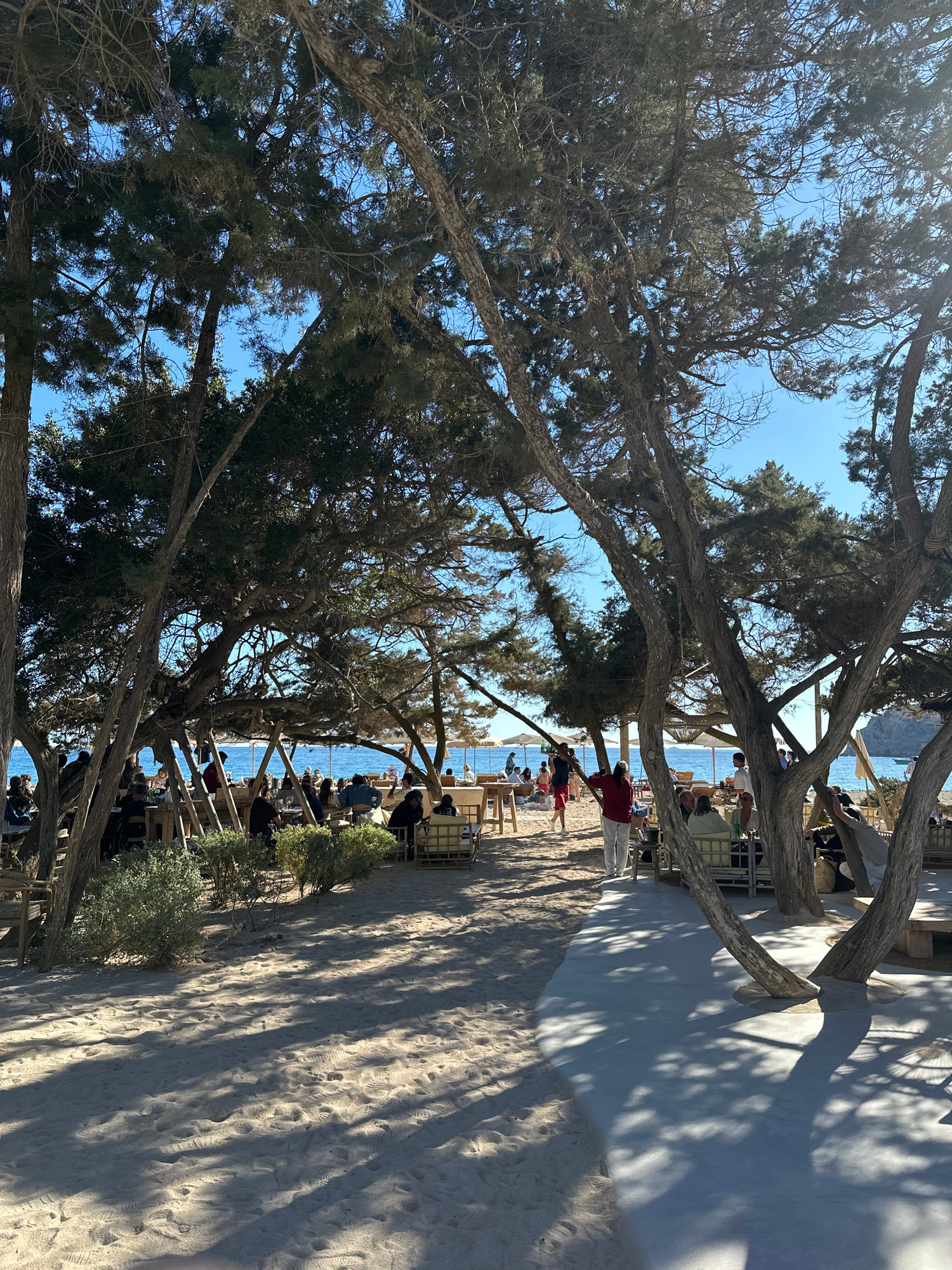 The image depicts a beachside restaurant scene in Sant Josep de sa Talaia, Spain. The foreground features tall, mature trees with dense foliage casting shadows on the sandy beach. In the background, p…read more