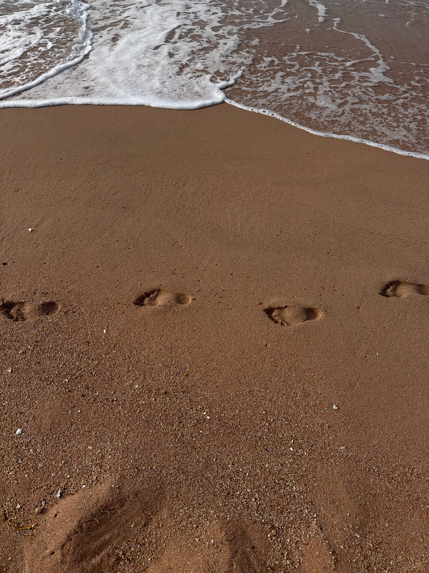 The image depicts a beach scene. White foamy waves are on the left side of the image meeting the sand. A line of footprints extends away from the water along the sand. The sand gradually changes textu…read more