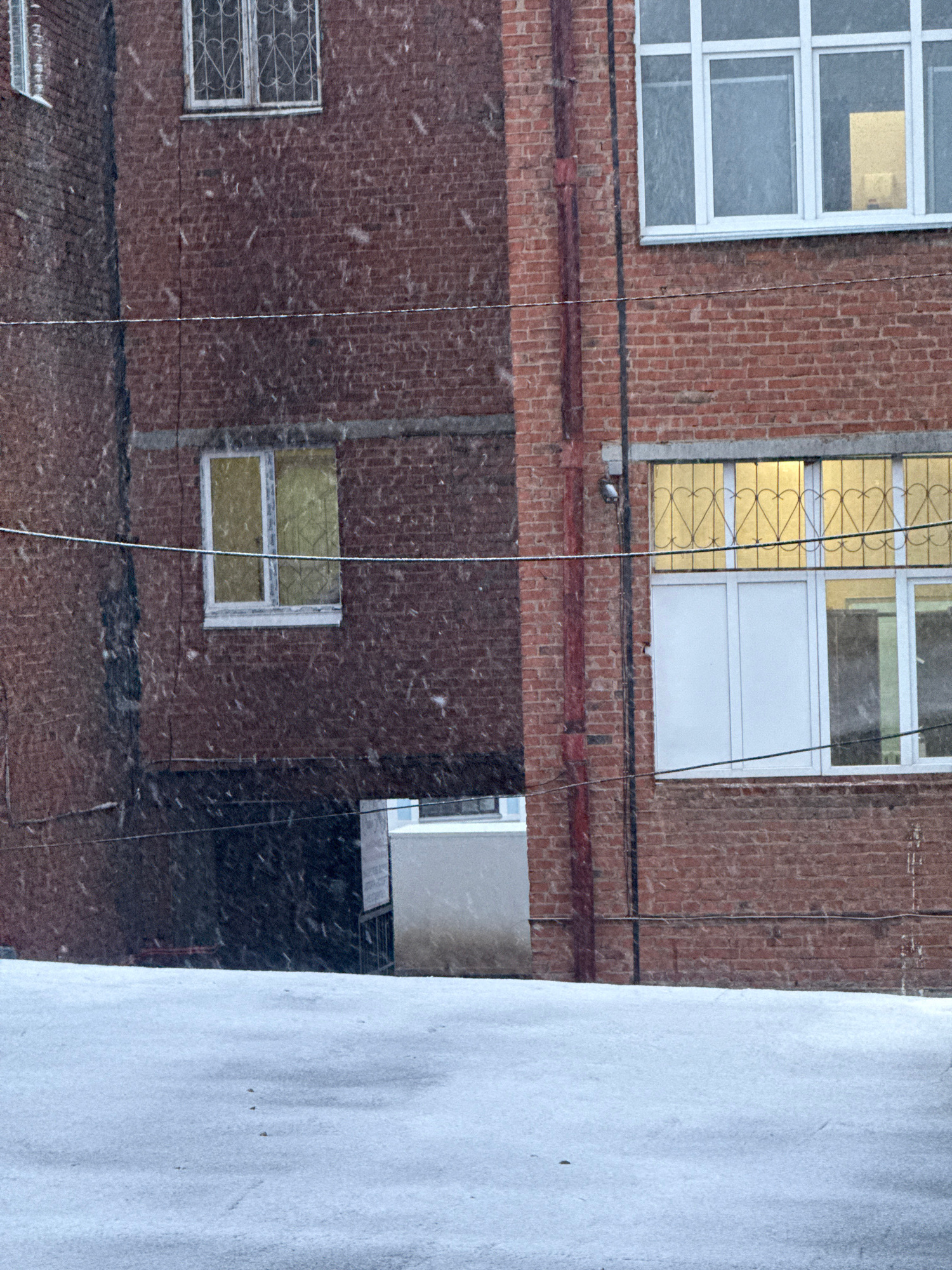 The image shows the exterior of a brick building with white-framed windows. It is snowing. In the foreground, there is a white wall partially obscuring the view. The architecture, including the brickwβ¦read more
