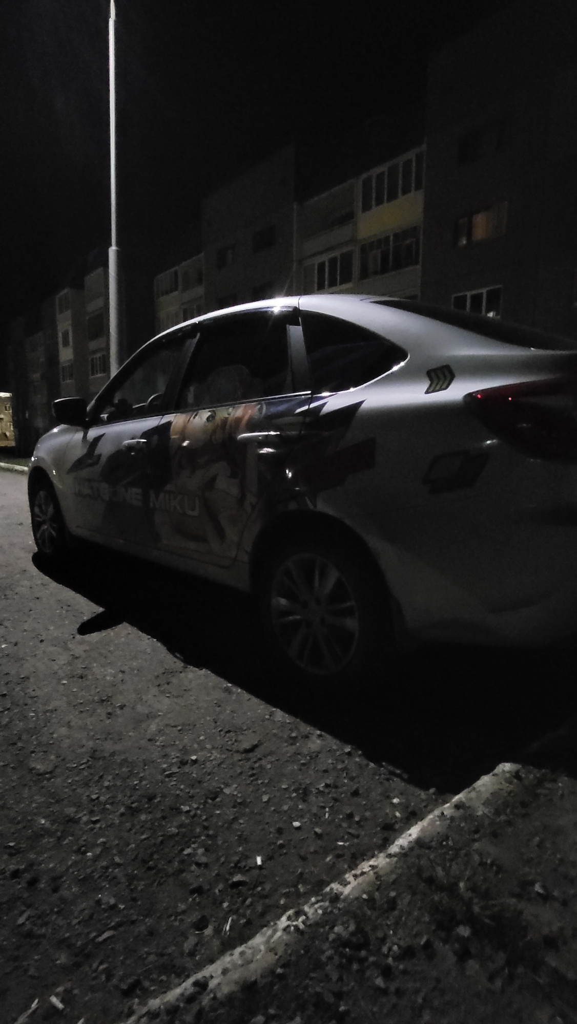 A car with a "Hatsune Miku" decal on the side is parked on a street in Марковский, Russia. The background shows buildings and a streetlight. It is dark. The car is parked on a paved road next to a cur…read more