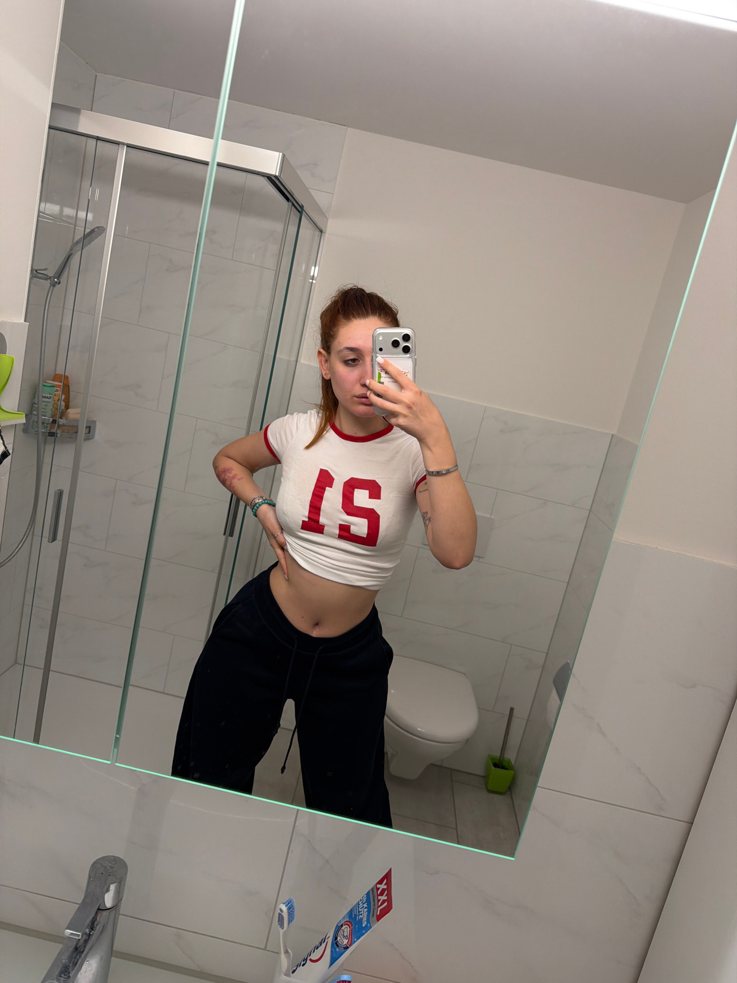A young woman is taking a mirror selfie in a bathroom. She is wearing a white crop top with a red number "15" on it and dark sweatpants. Her face is visible and she has red hair. The background of the…read more