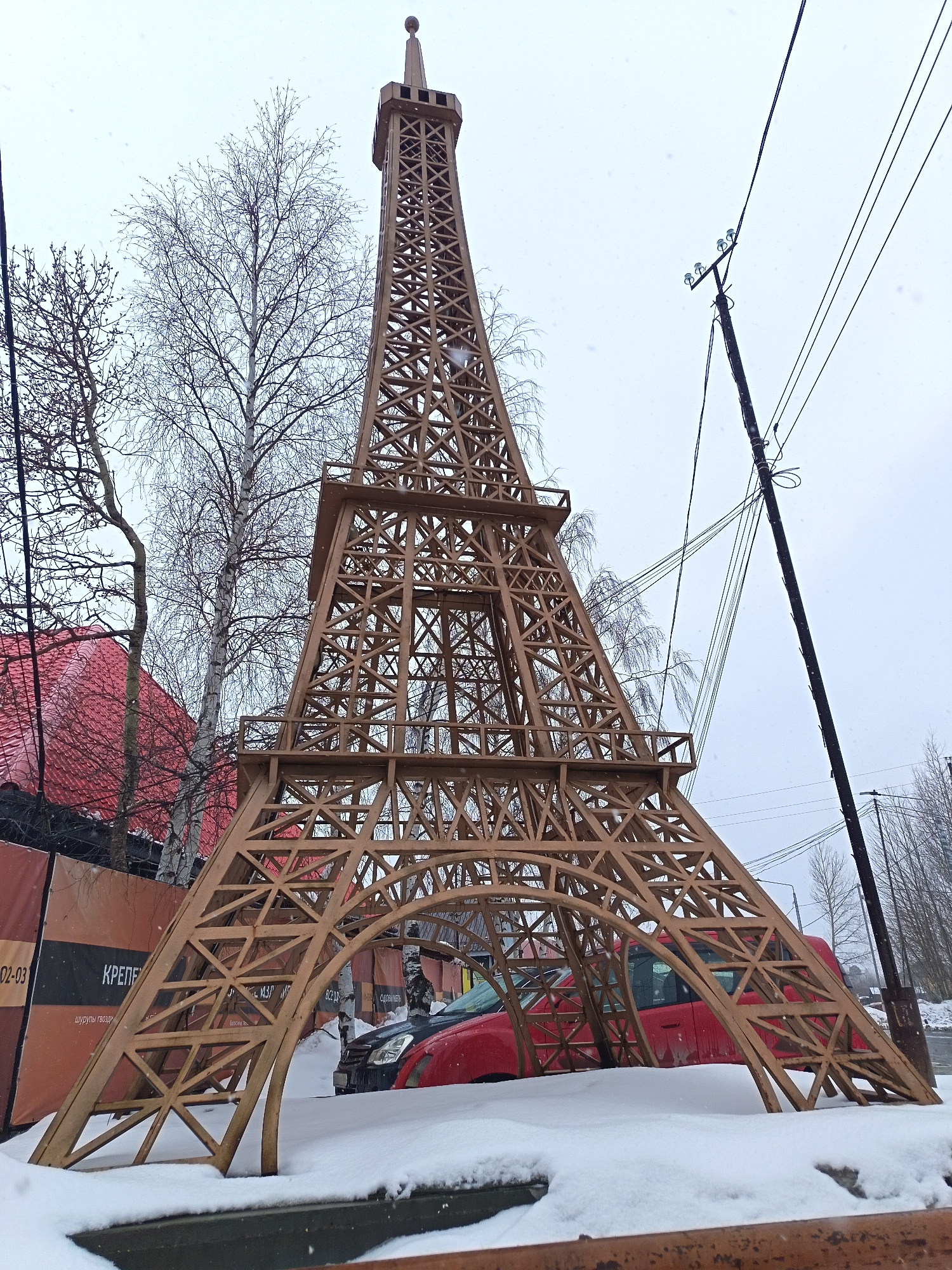 A ground-level, wide-angle shot depicts a replica of the Eiffel Tower in Nizhnevartovsk, Russia. The tower, constructed from a light brown material, possibly wood or metal, is set against a snowy back…read more