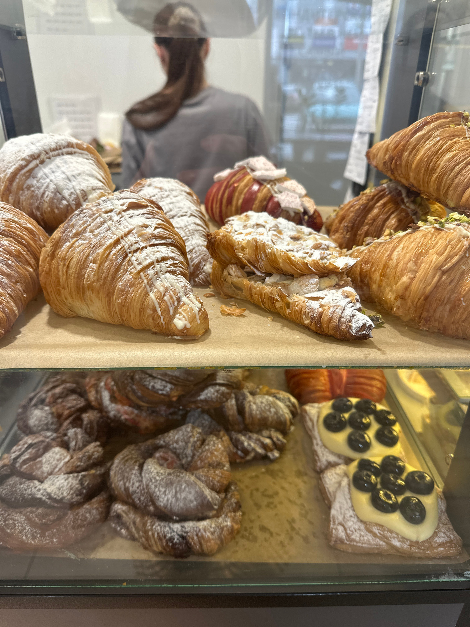 The image shows a display case in what appears to be a bakery or pastry shop. The display case contains a variety of pastries, including several croissants with powdered sugar, a croissant with pistac…read more