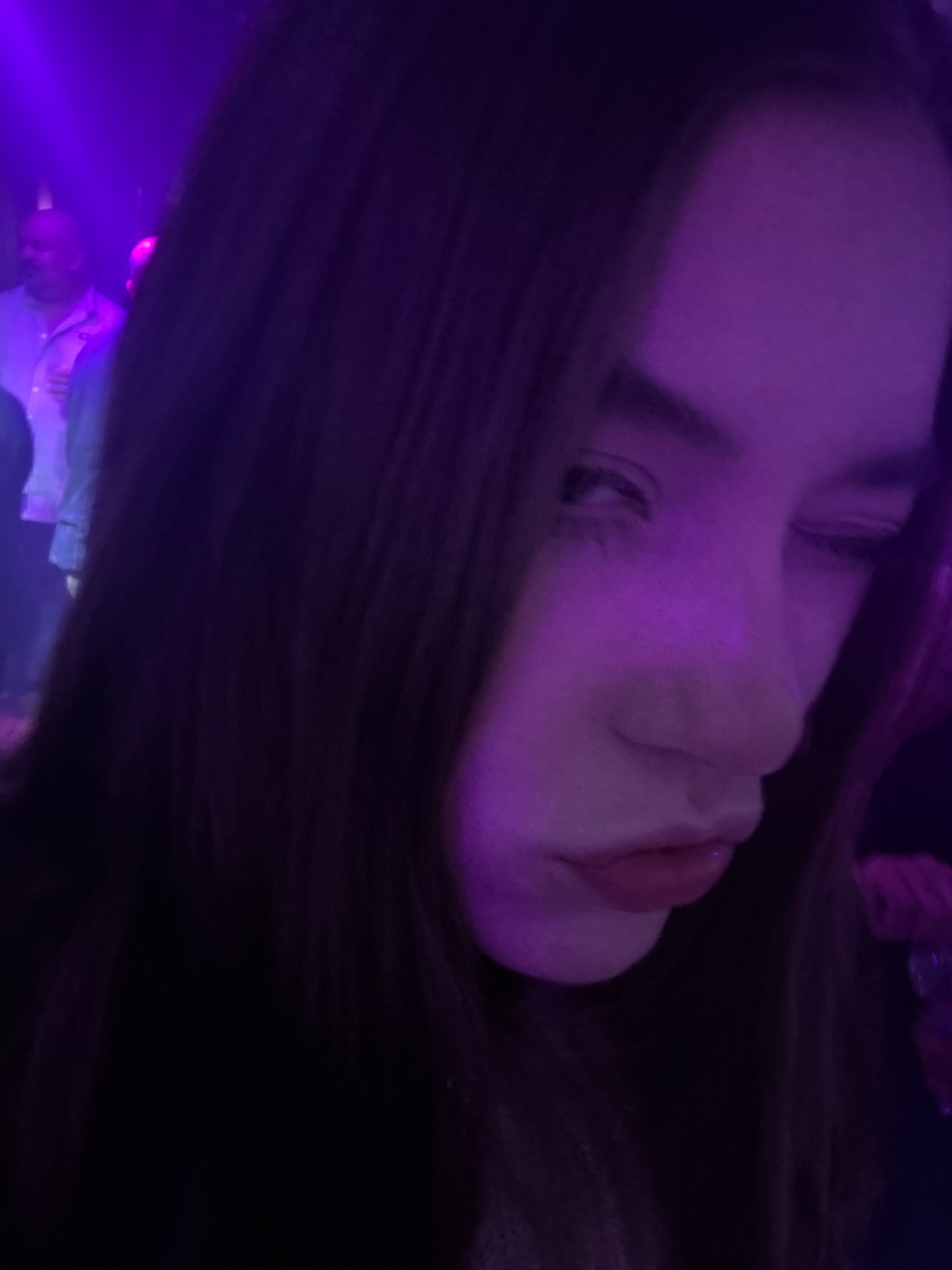 A close-up, canted angle portrait of a woman with long brown hair, illuminated by purple lighting. The background appears to be a dimly lit space with other people present but indistinct. Location can…read more