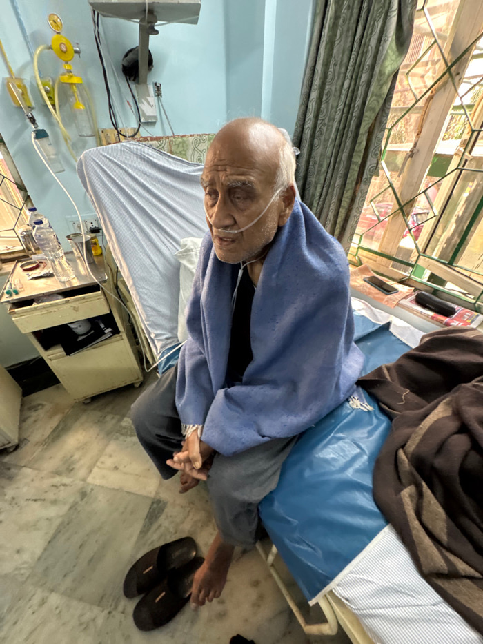 An elderly man rests in a hospital bed, wearing a blue blanket and an oxygen tube in his nose. His bare feet are near a pair of dark slippers. The bed is equipped with medical equipment and tubes. A w…read more