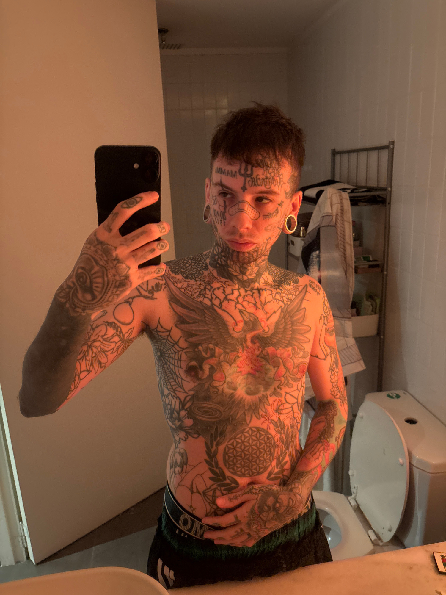 A man with extensive tattoos covering his face, torso, arms, and hands takes a selfie in a bathroom mirror. He's wearing dark shorts with a visible waistband. The bathroom includes a toilet, a rack ab…read more