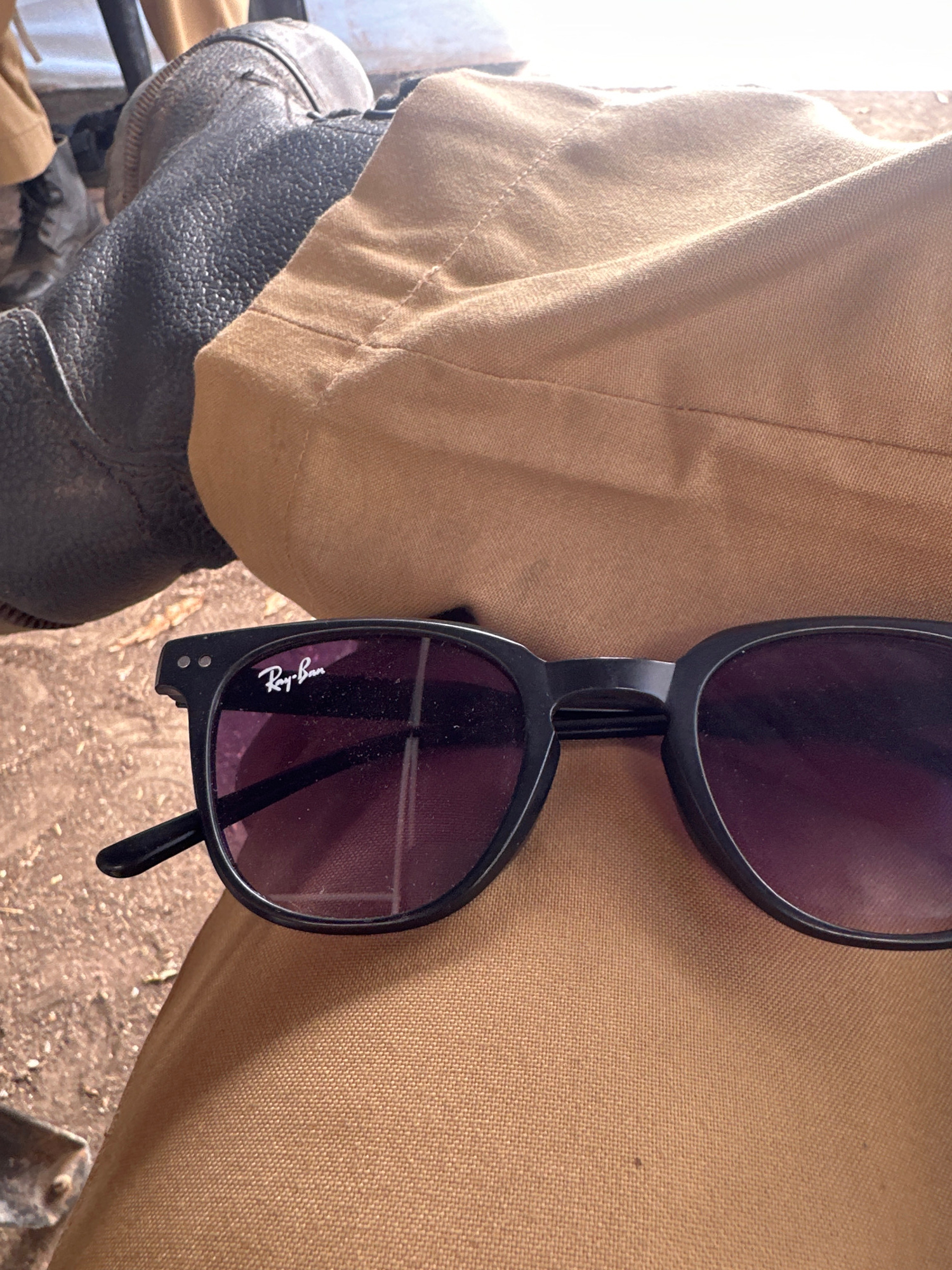 A pair of black Ray-Ban sunglasses rests against tan pants, possibly khaki, with the edge of a dark leather boot visible at the lower left. The background is indistinct but appears to be rough ground…read more