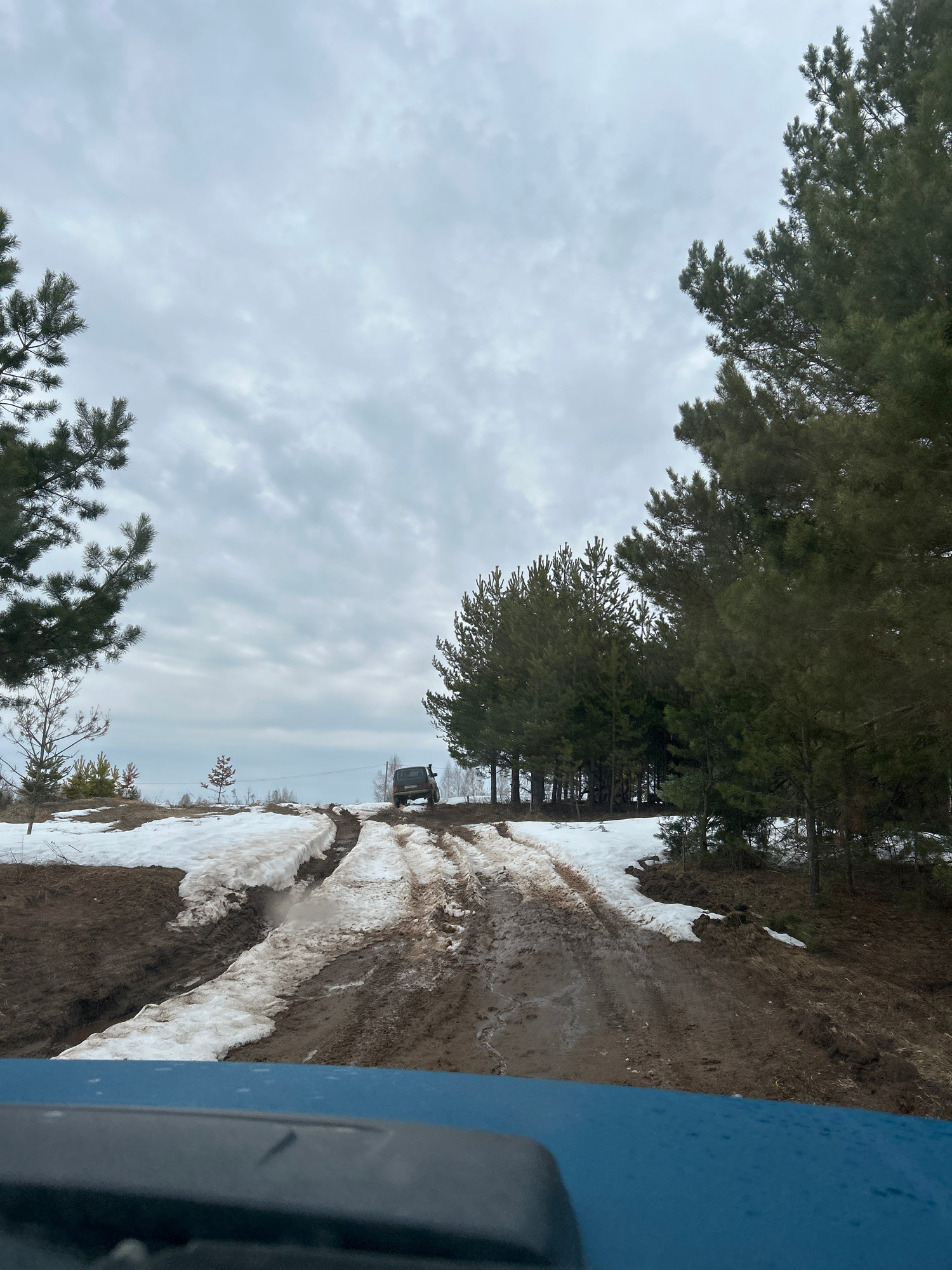 The image shows a muddy, partially snow-covered path flanked by trees and a cloudy sky, in an unspecified location. A dark-colored vehicle is visible in the distance on the path. A portion of what app…read more