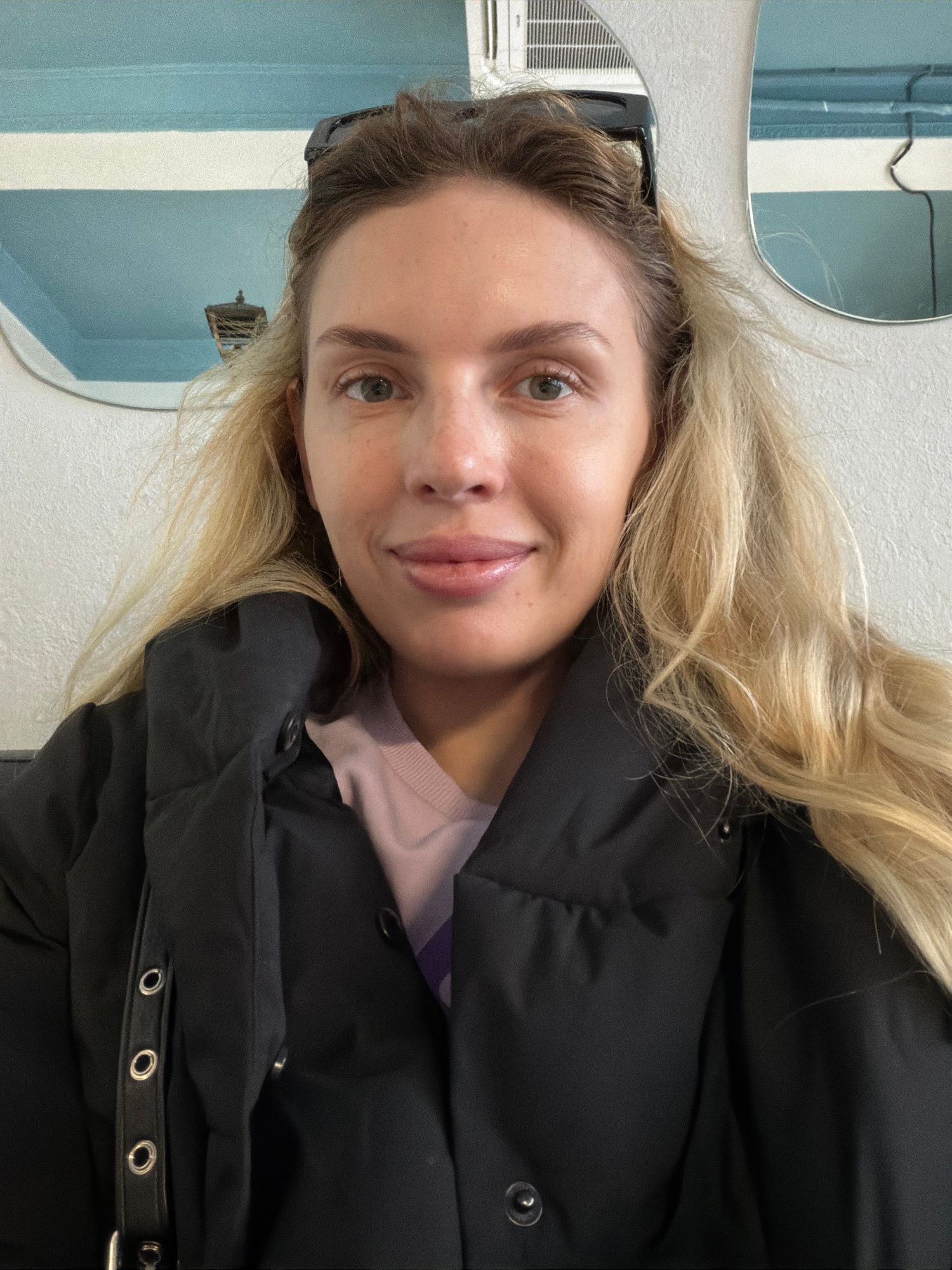 A woman with blonde hair is pictured indoors, wearing a black jacket and a pink top, with a mirror and blue wall visible in the background. The location is Kamianske, Ukraine.