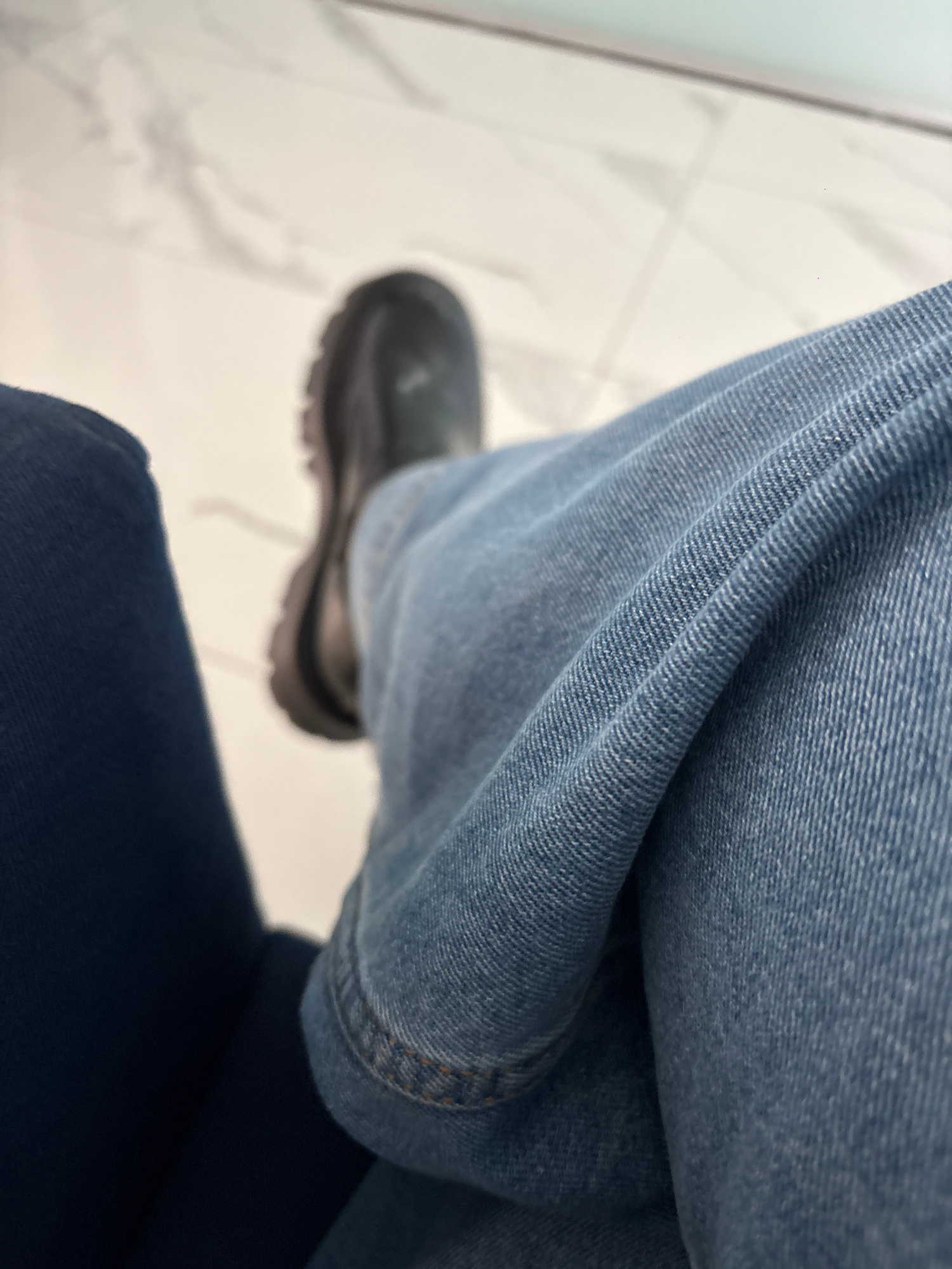 The image shows a person wearing blue jeans and a black shoe. The person is sitting on a dark blue chair. The floor appears to be white tile. The location cannot be determined from the image.