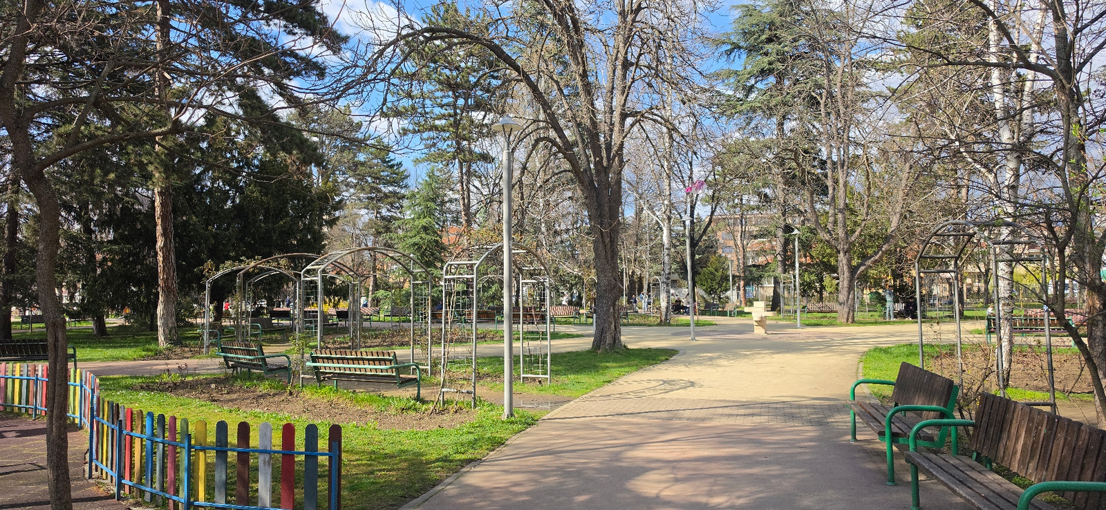 The image shows a park in Kazanlak, Bulgaria on a sunny day. The park features a paved walkway curving through the center, bordered by grassy areas with trees. Several metal archways are arranged alon…read more