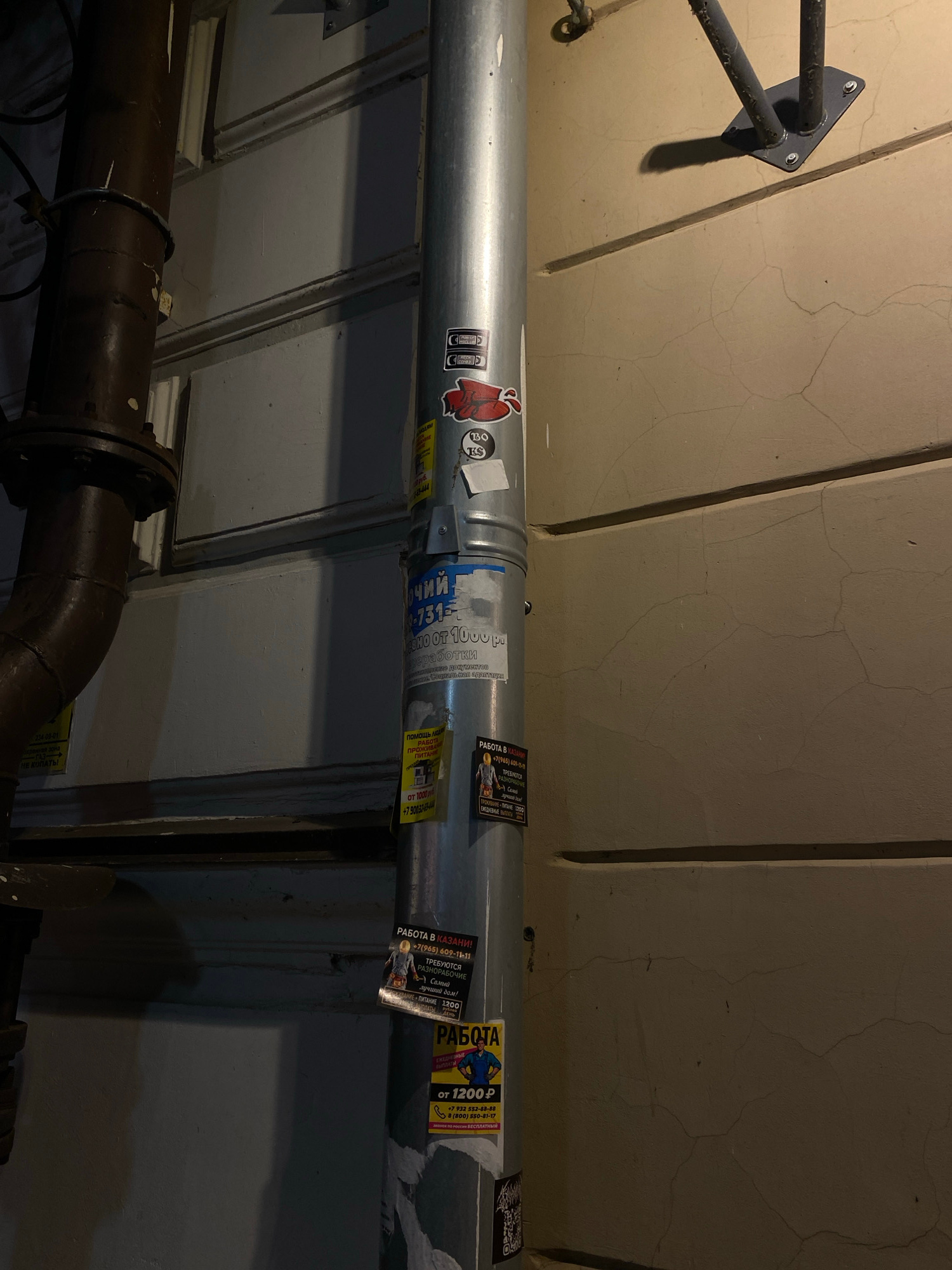 The image shows a section of the ceiling of a building in Kazan, Russia, with two pipes running horizontally across the frame. The upper pipe is metallic and covered with stickers, including advertise…read more