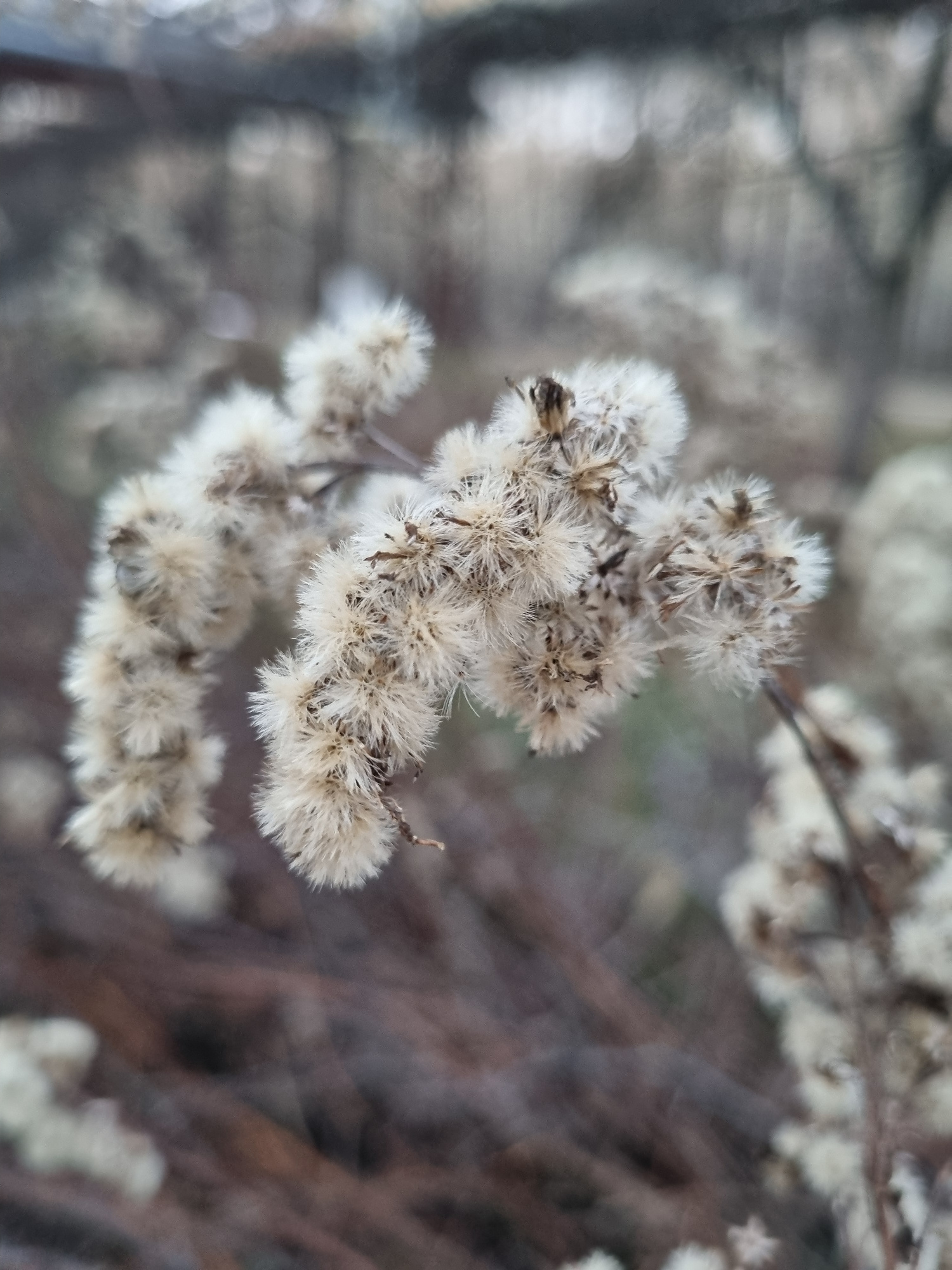 The image features a close-up view of a cluster of dried, white, fluffy seed heads, possibly from a plant like goldenrod or a similar species in the Asteraceae family. These seed heads are attached to…read more