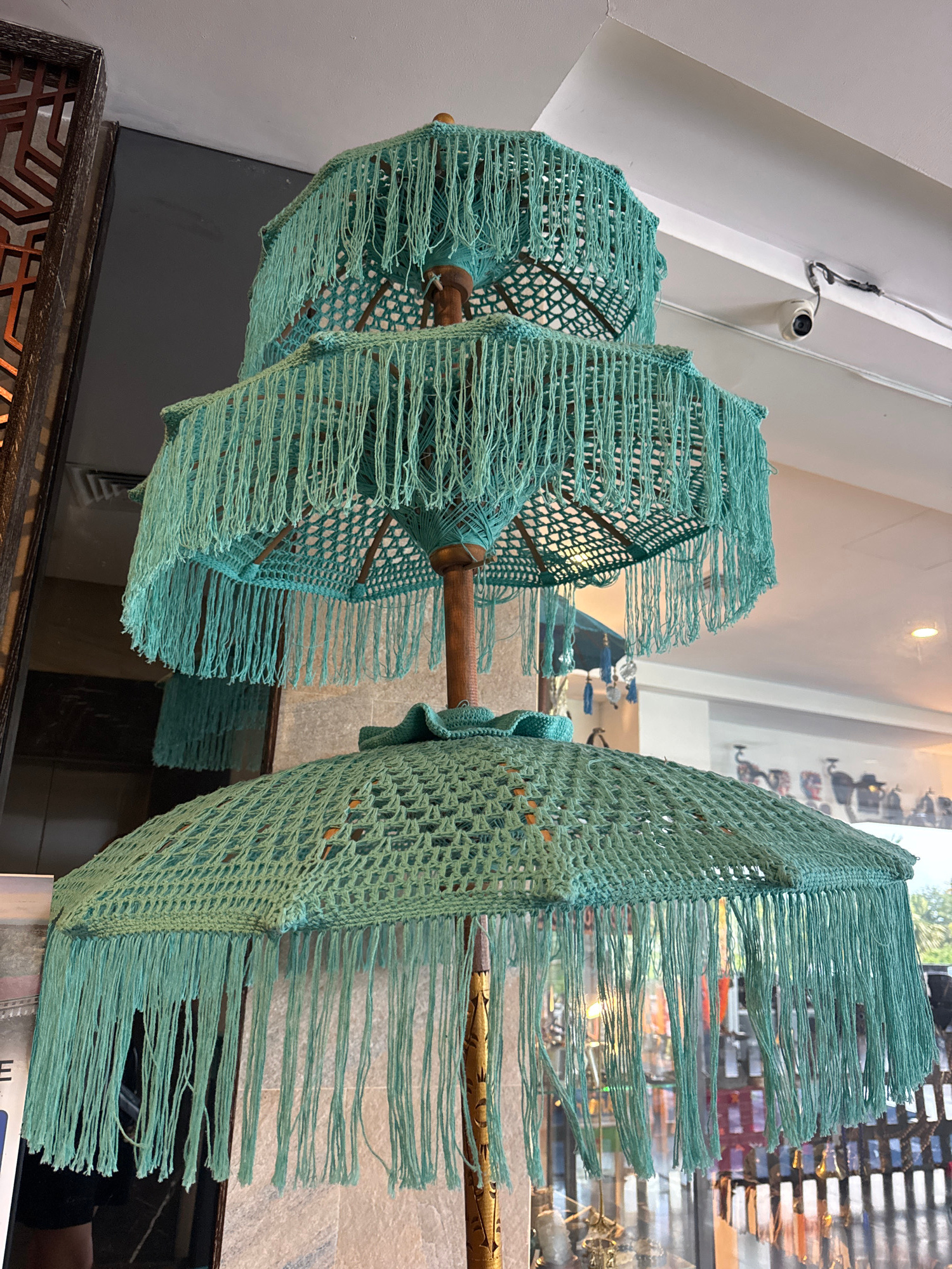 The image shows two decorative objects resembling fringed umbrellas suspended from a wooden rod, likely in an interior space in Pecatu, Indonesia. The "umbrellas" are constructed with turquoise-colore…read more