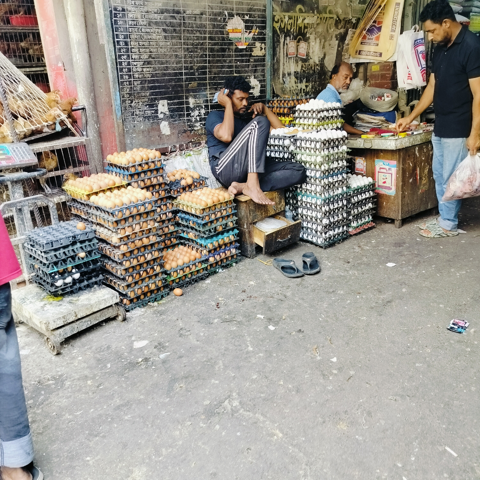 This image depicts a street scene in Dhaka, Bangladesh, likely a marketplace. The scene features multiple individuals and focuses on the sale of eggs. In the foreground, stacks of egg trays filled witβ¦read more