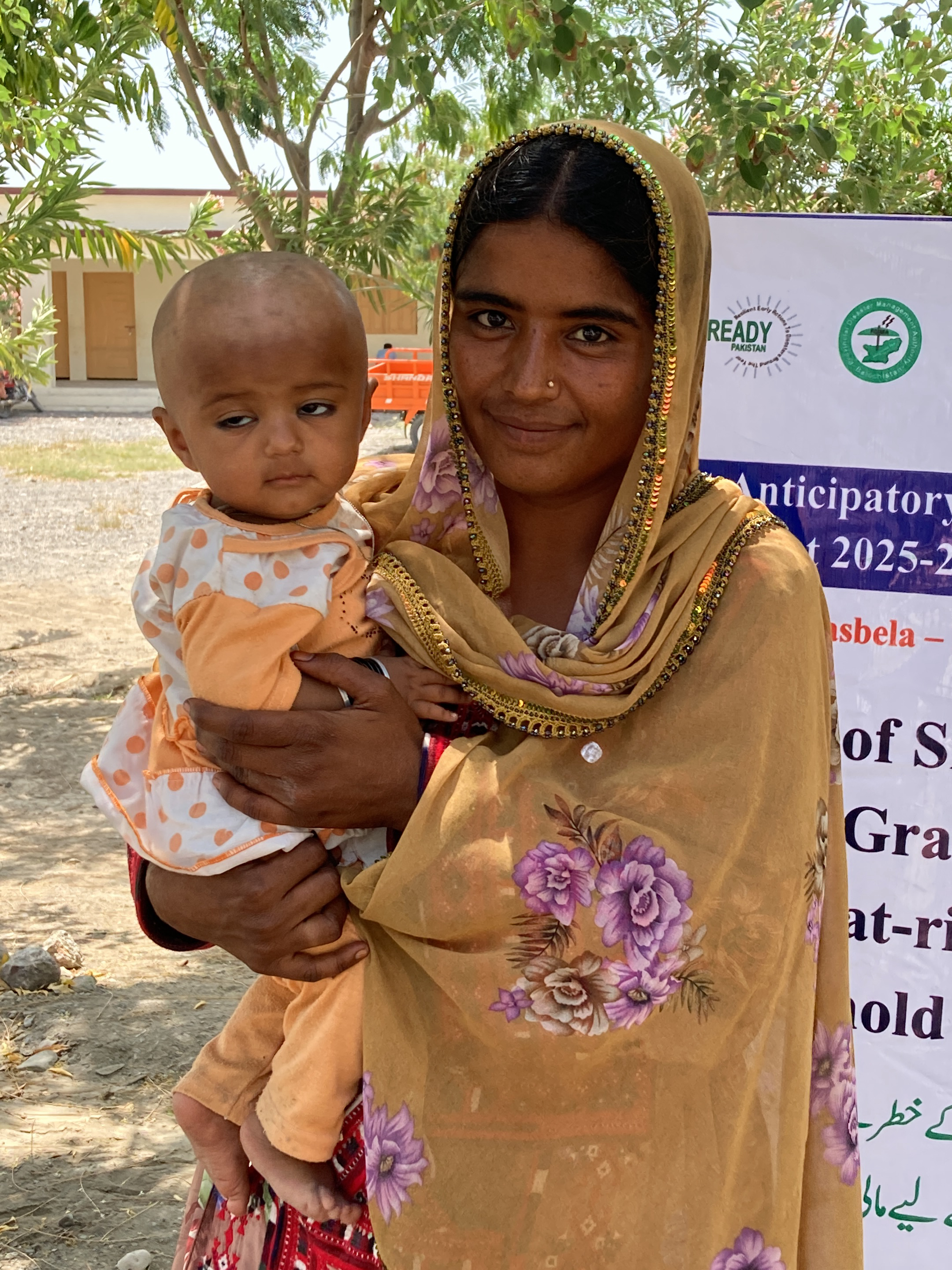 A woman holds a baby in her arms, with a building in the background. The woman wears a patterned, beige head covering with floral designs. She has dark hair and brown skin. The baby has light skin and…read more