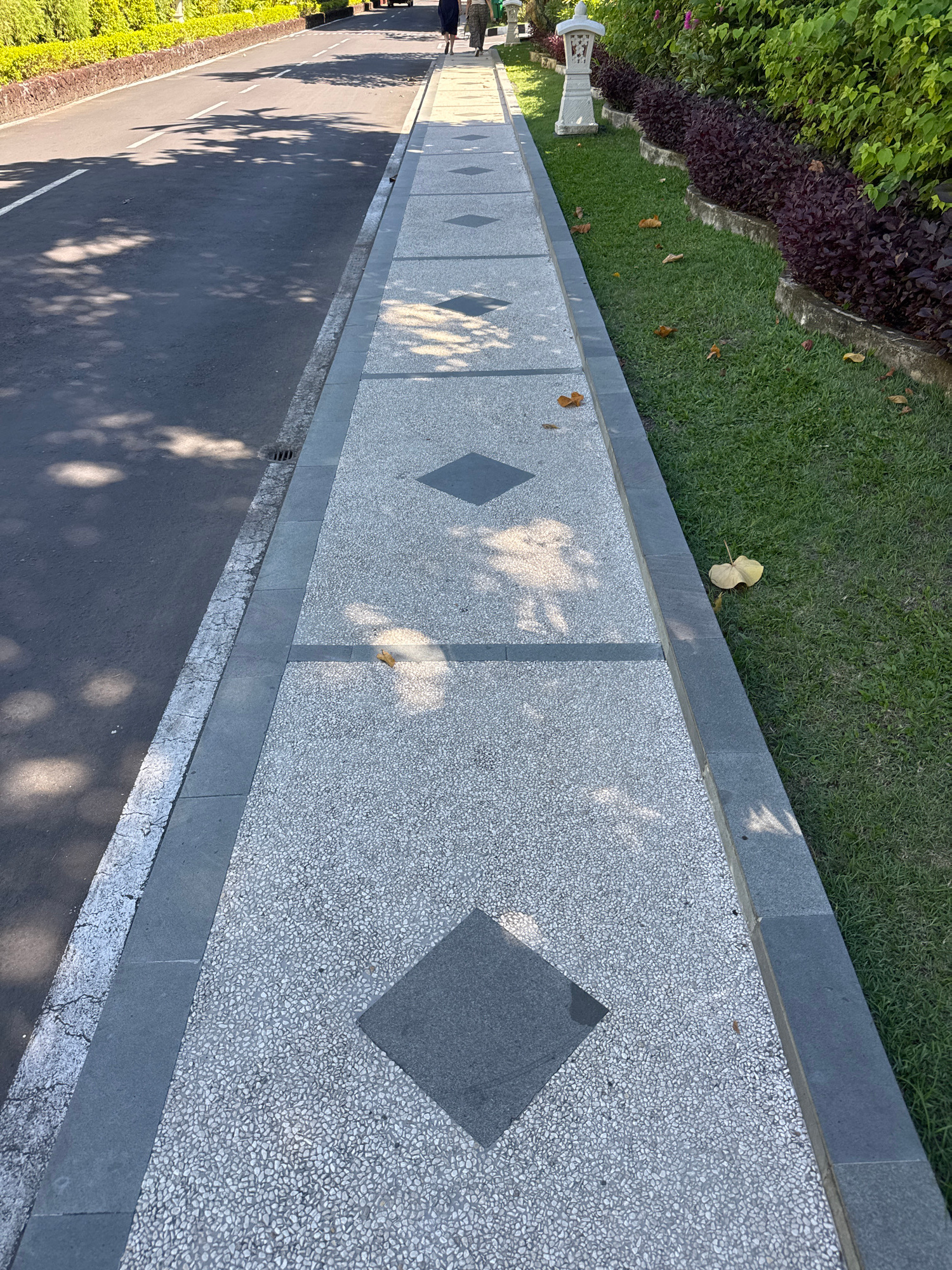 This elevated view captures a well-maintained outdoor scene in Denpasar, Indonesia, focusing on a pedestrian walkway, a road, and surrounding greenery under clear, sunny conditions. The central subje…read more