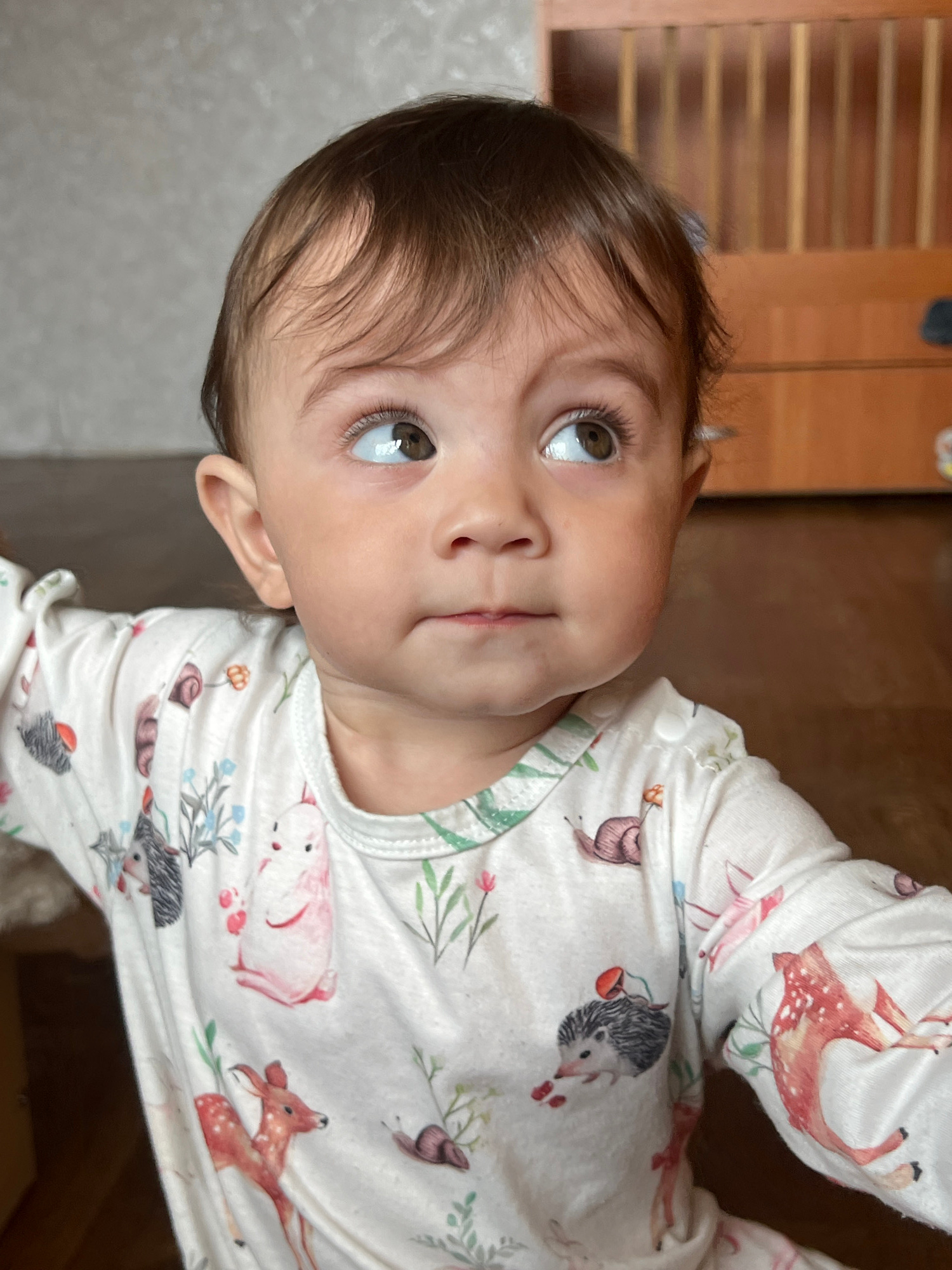 A close-up, frontal portrait captured in an indoor setting in Elena, Bulgaria, features an infant. The subject, with dark brown hair and brown eyes, is looking upwards and to the right, displaying a sā¦read more