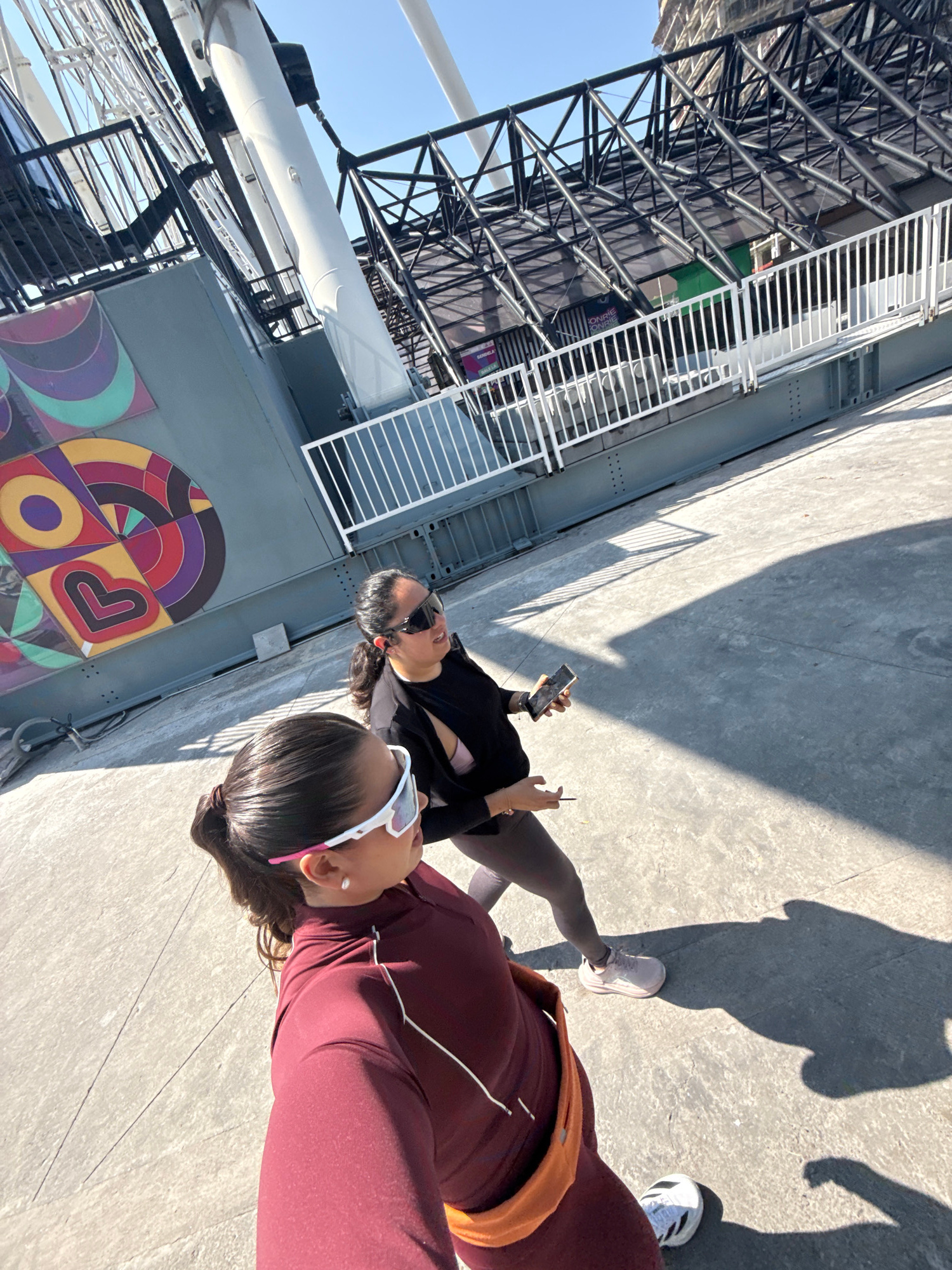 The image shows two individuals on a rooftop platform in Puebla, Mexico. One person is wearing a burgundy tracksuit with an orange belt or fanny pack, and white athletic shoes are visible. The other i…read more