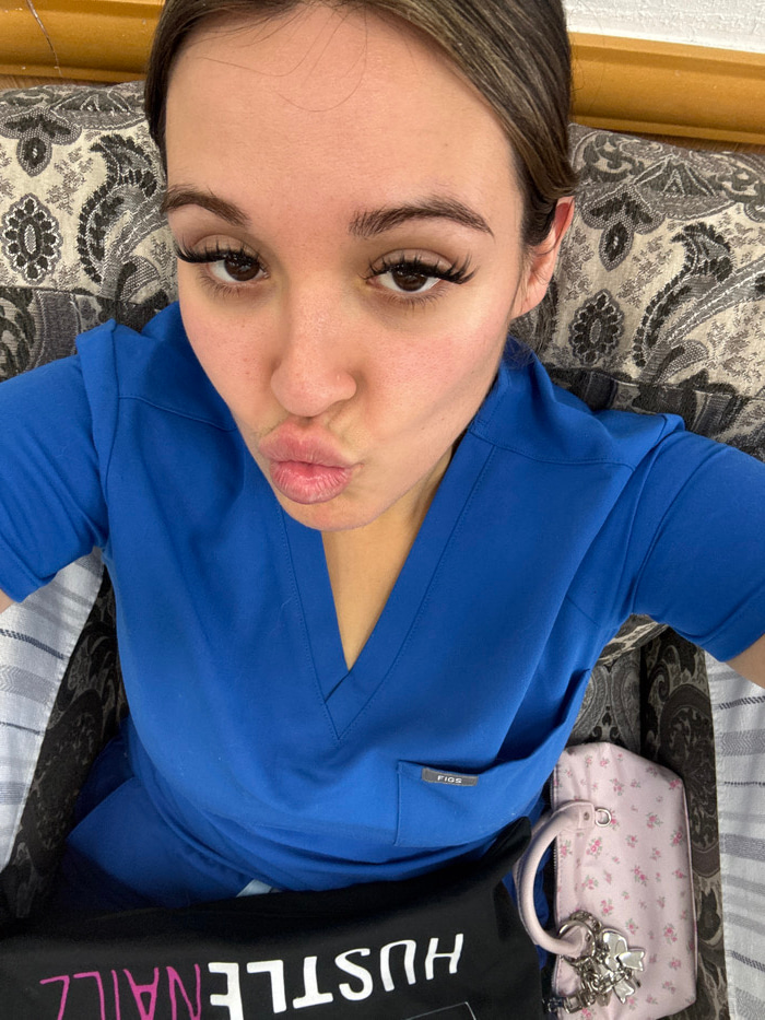A woman wearing bright blue scrubs with a "FIGS" tag is lying on a patterned pillow. She has long eyelashes and pursed lips. Next to her is a small, pink floral purse with a handle and a silver charm.…read more