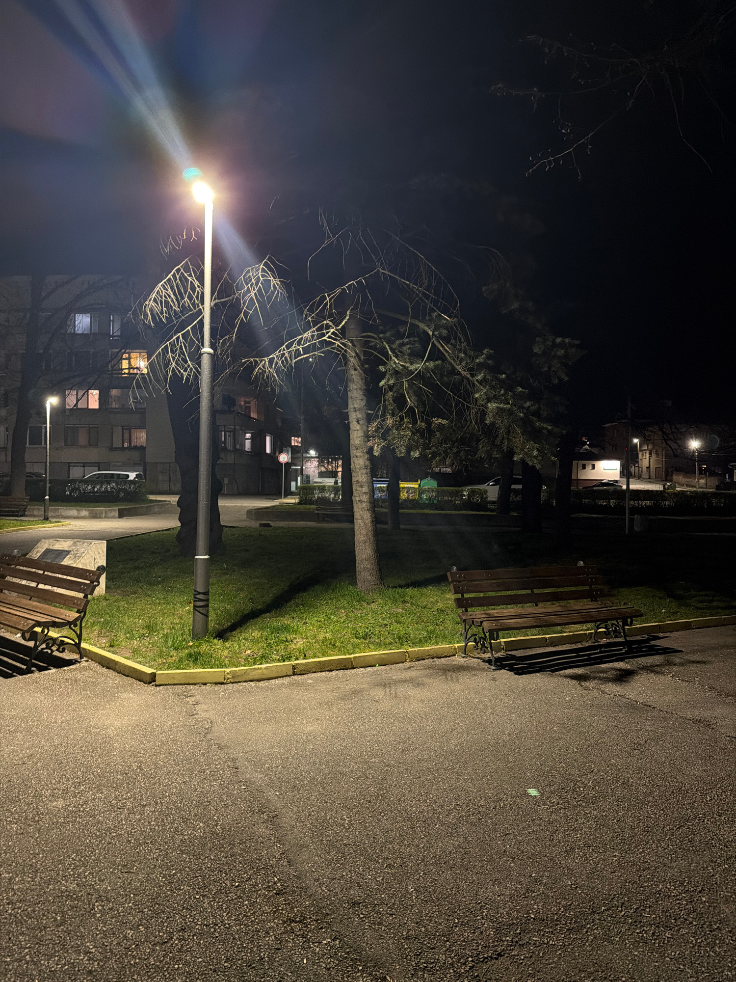 The image depicts a night scene in Panagyurishte, Bulgaria. A paved pathway runs along the right edge of the image, adjacent to a narrow strip of grass. Two wooden benches with ornate metal supports a…read more