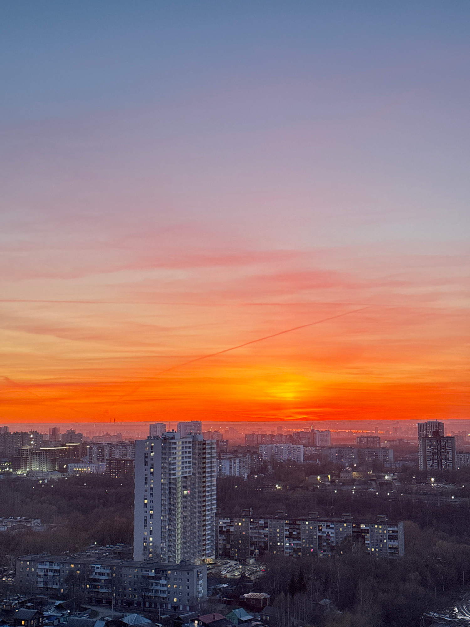 This panoramic image captures a breathtaking view of the city of Perm, Russia, during either sunrise or sunset. The sky dominates the upper portion, displaying a spectacular gradient of colors. At theβ¦read more