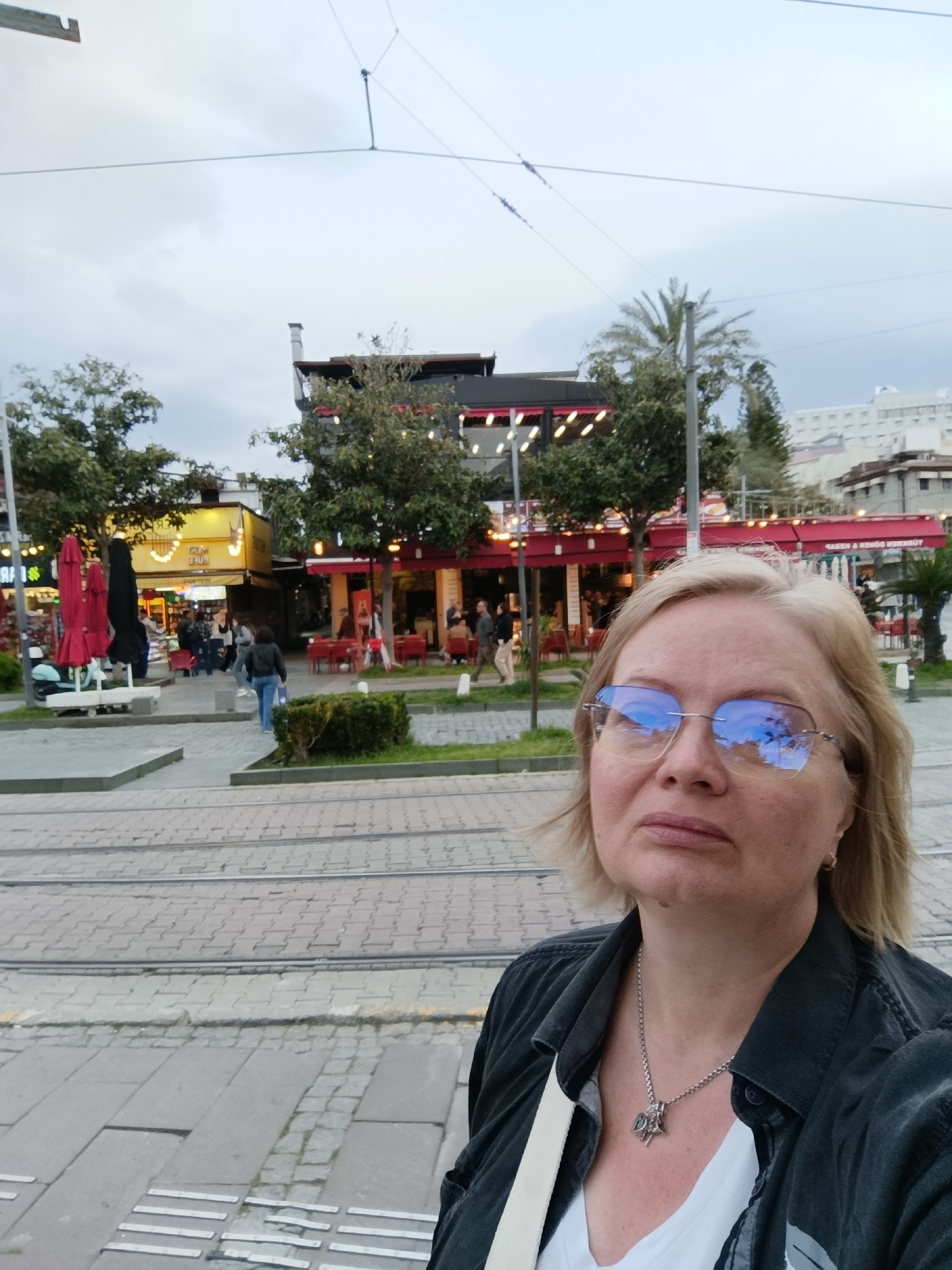 A woman takes a selfie in front of a public plaza. The woman has blond hair and wears glasses, a black jacket, a white top, and a silver necklace. She is standing on a light gray brick surface with taβ¦read more