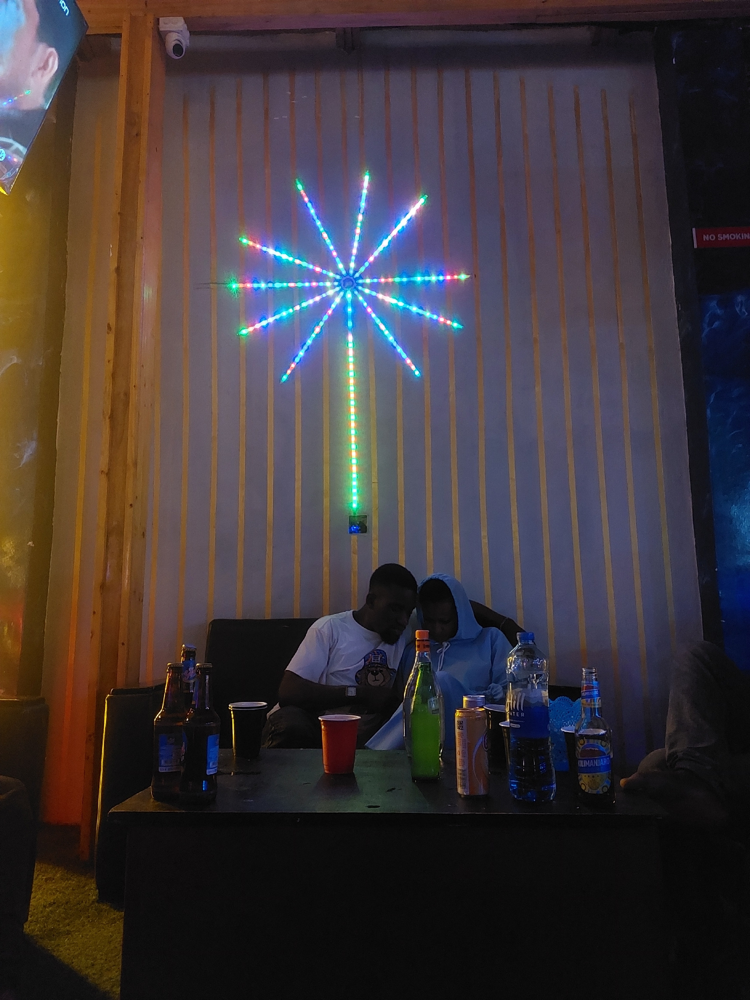 The image shows an indoor setting, possibly a bar or lounge, featuring two individuals and several bottles of beverages. The background wall is decorated with horizontal yellow stripes and a starburst…read more