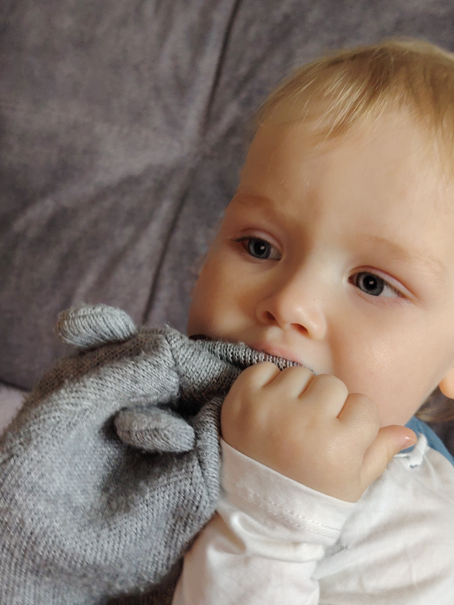 A young child with blonde hair is shown in a close-up shot. The child is holding a grey knitted object, possibly a toy or blanket, and has a portion of it in their mouth. The child's hand is also clos…read more