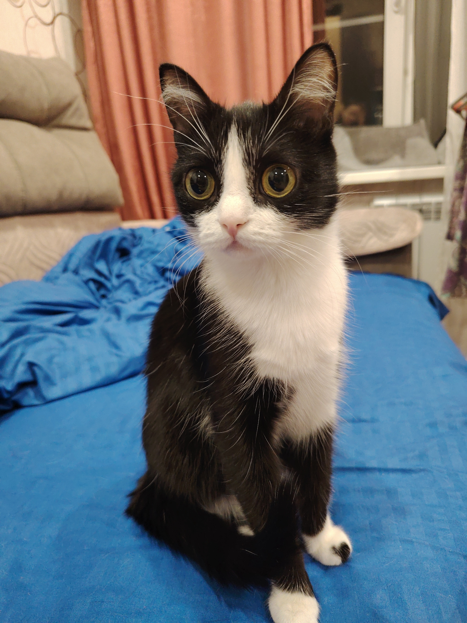 A black and white cat is sitting on a blue bed. The cat has large, yellow eyes and a white chest. The background includes pillows, curtains, and a window. The location is Unknown, Unknown.