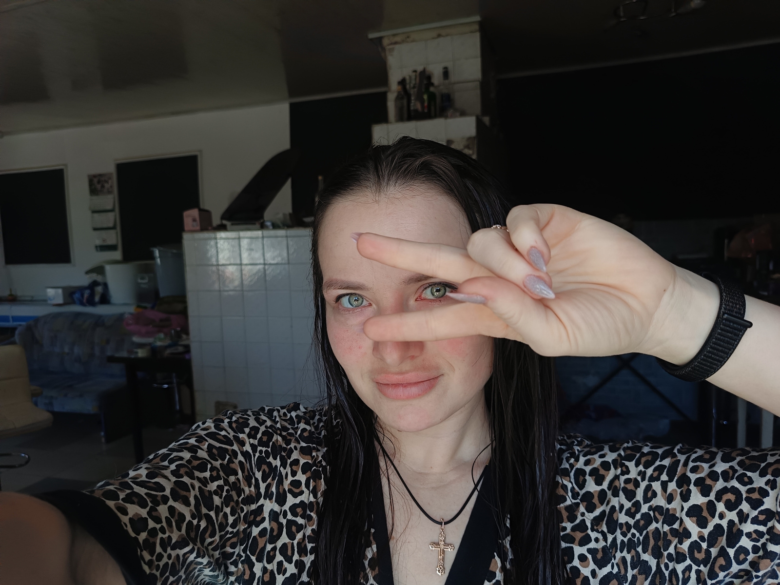 A selfie taken by a fair-skinned woman with long, dark, wet hair and light-colored eyes. She is wearing a leopard print robe and a necklace with a gold-colored cross pendant. She is making a peace sig…read more