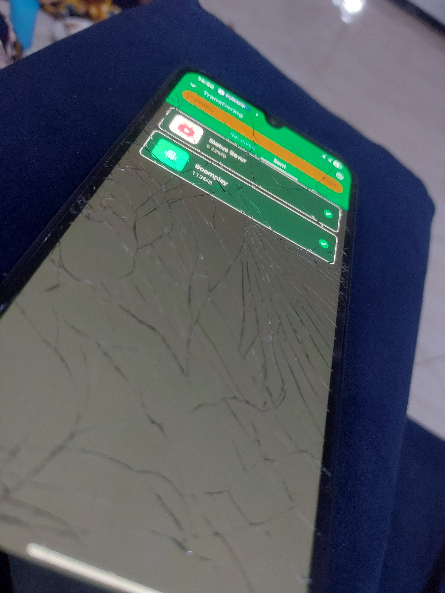 The image shows a smartphone with a heavily cracked screen lying on a dark blue cloth or surface. The phone is displaying notifications, possibly related to file transfers or downloads. The screen dam…read more