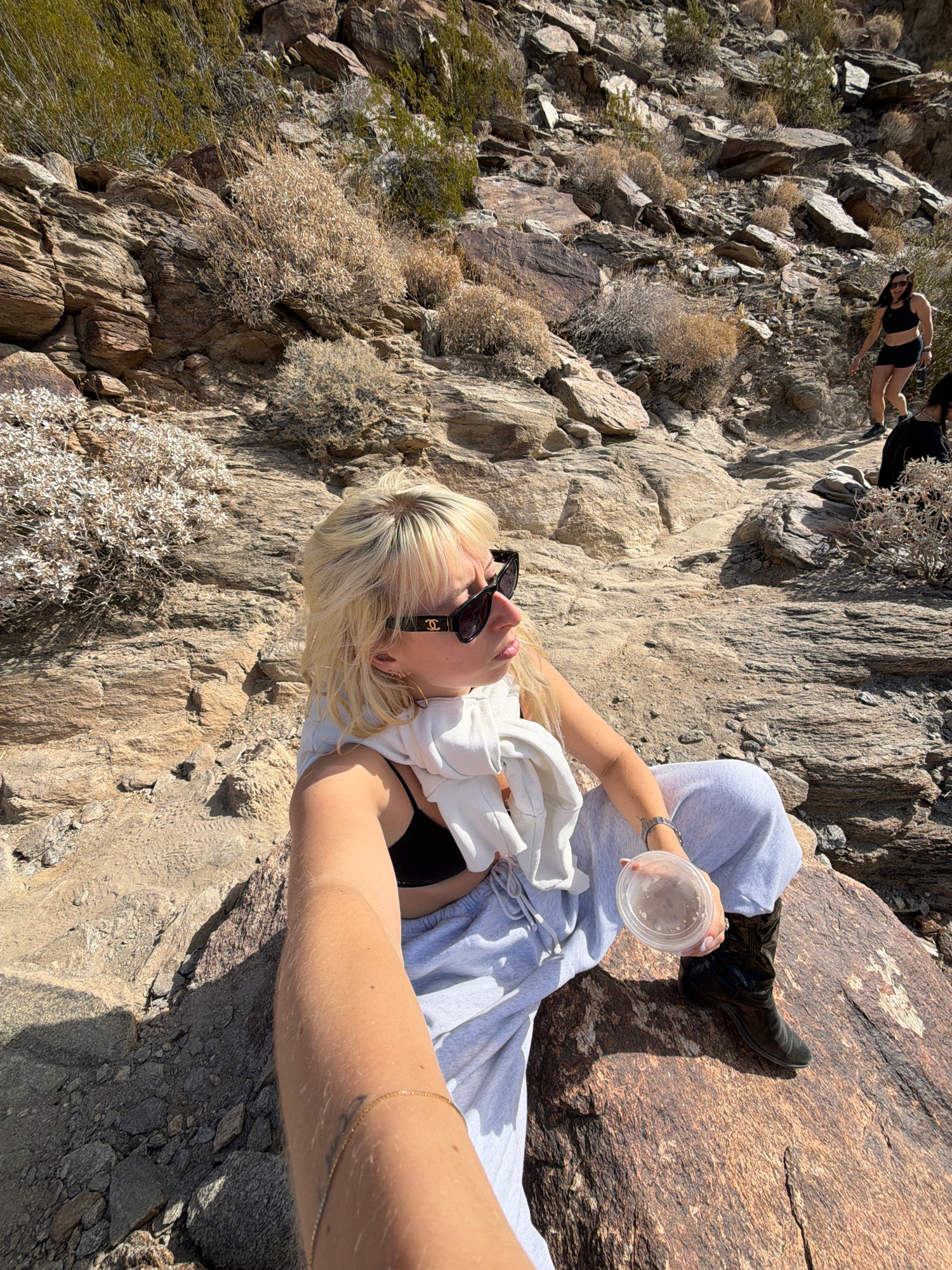 A woman with blonde hair wearing sunglasses, a black top, and grey sweatpants is holding a plastic container while sitting on a rock in what appears to be a desert landscape. She is also wearing black…read more