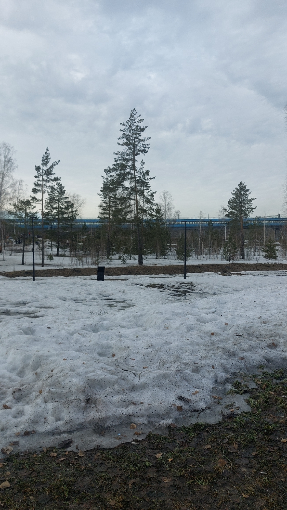 The image depicts a winter scene in Novosibirsk, Russia. The foreground shows a snow-covered area merging into a muddy patch with sparse grass and fallen leaves. In the midground, there are several pi…read more