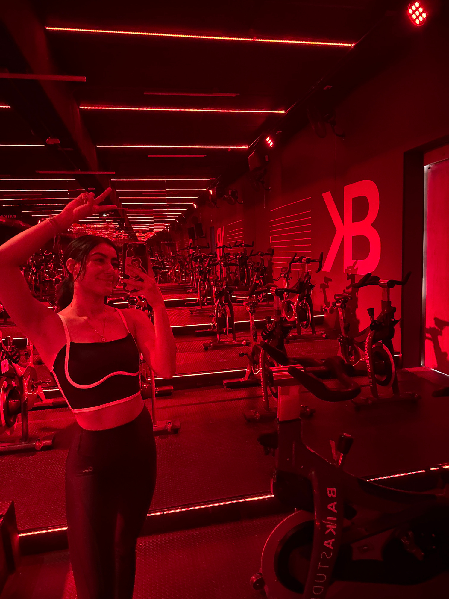 The image depicts a woman in a black and white athletic top and black leggings taking a selfie in a red-lit indoor cycling studio, identified by the backwards "BK" logo and the inverted text "BIKESTUD…read more