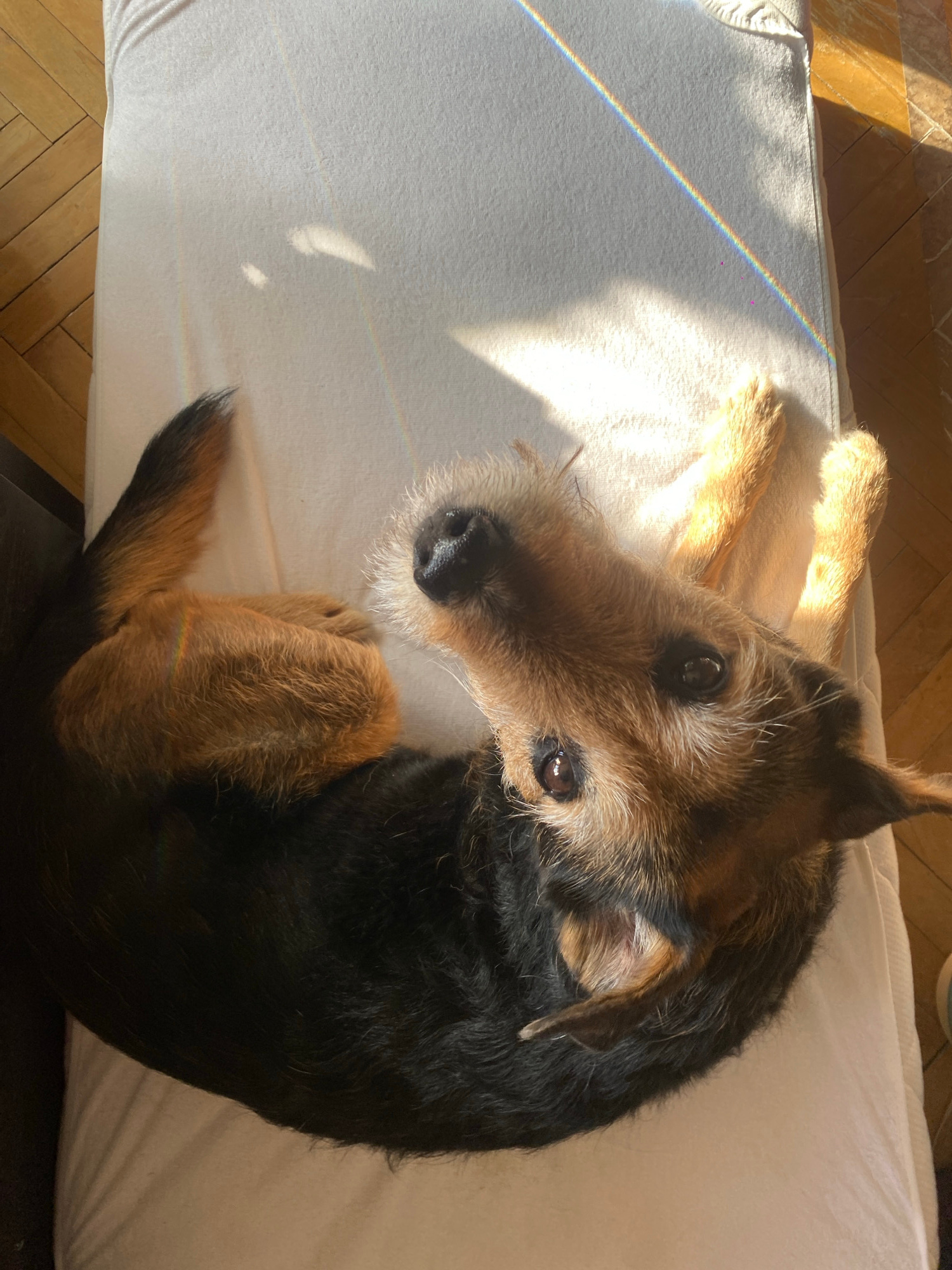 A close-up, overhead shot shows a brown and black terrier-type dog lying curled on a white surface, possibly a bed or cushion. Sunlight streams in from the left, creating a rainbow effect on the whiteβ¦read more