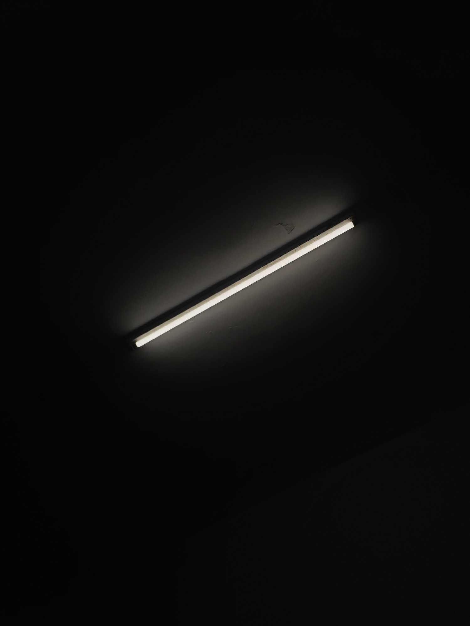A stark, almost monochromatic image features a single fluorescent light tube against a dark, likely black ceiling. The light is positioned diagonally, illuminating a narrow area around it. The scene l…read more