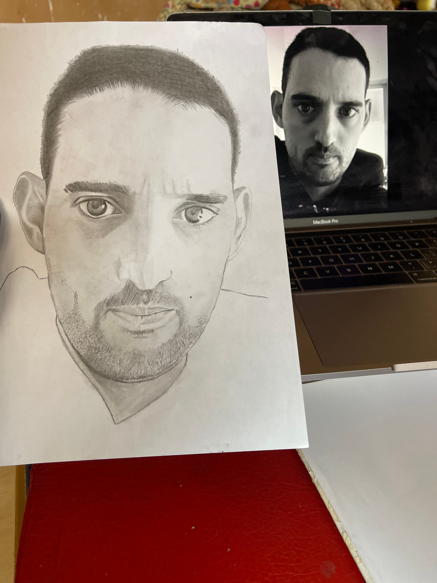 A color photograph depicts a graphite portrait drawing laid next to a laptop displaying a black and white photograph of the same man. The portrait is on white paper and shows the man's face in a simil…read more