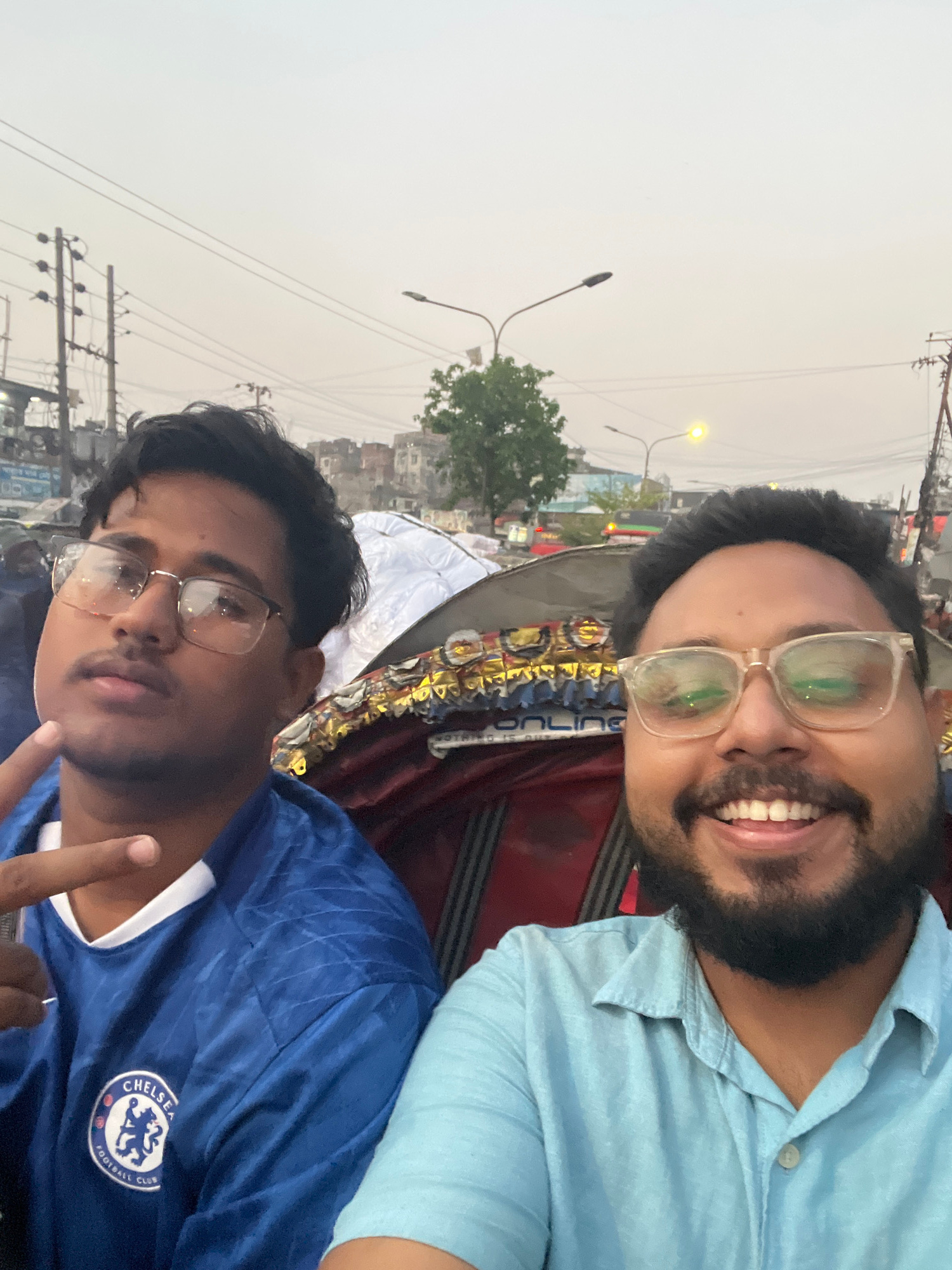 Two men are in a rickshaw, likely traveling on a street in Dhaka, Bangladesh. One man is wearing a blue Chelsea football jersey, and the other a light blue button-down shirt and glasses. Buildings, po…read more