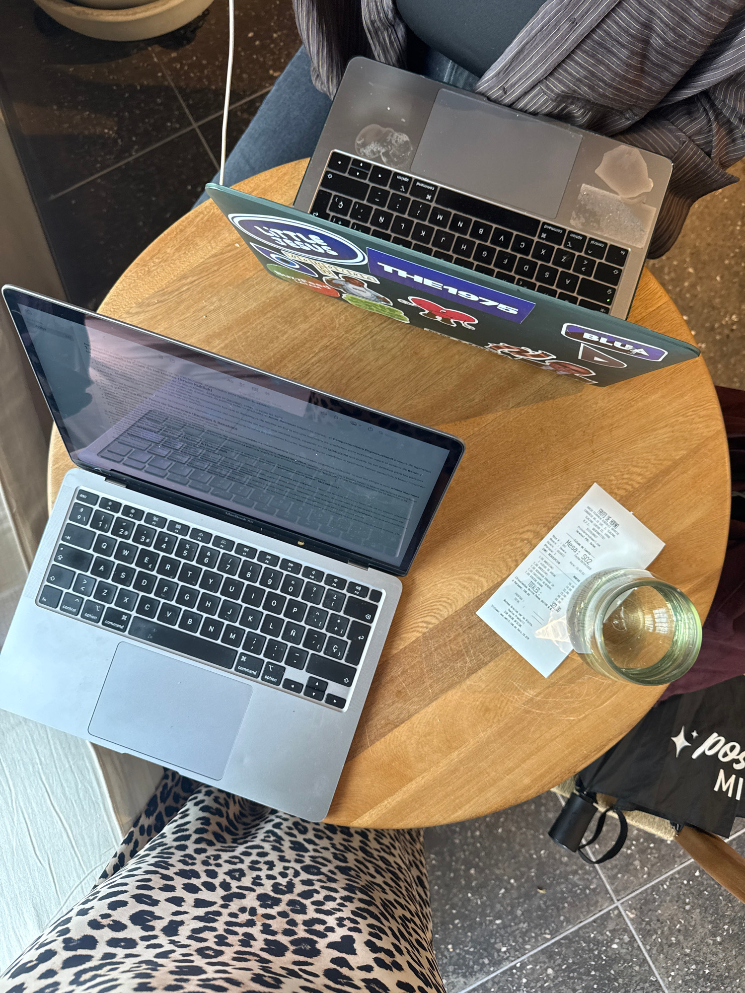 The scene is a close-up, overhead shot of a circular wooden table in what appears to be a cafe or workspace in Mexico City, Mexico. Two open laptops are prominently featured, one with stickers on its…read more