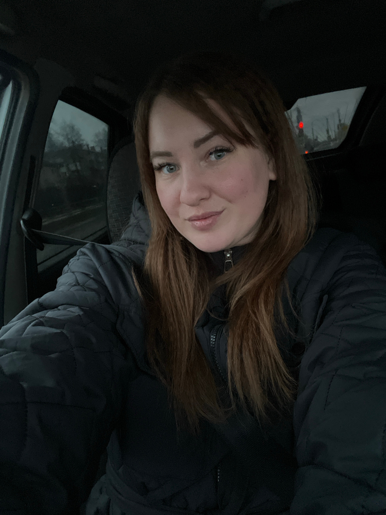 A woman with long, auburn hair is in a vehicle. She is wearing a black jacket. Outside the vehicle's window, it appears to be a cloudy or overcast day. A red light is visible outside the window. Based…read more