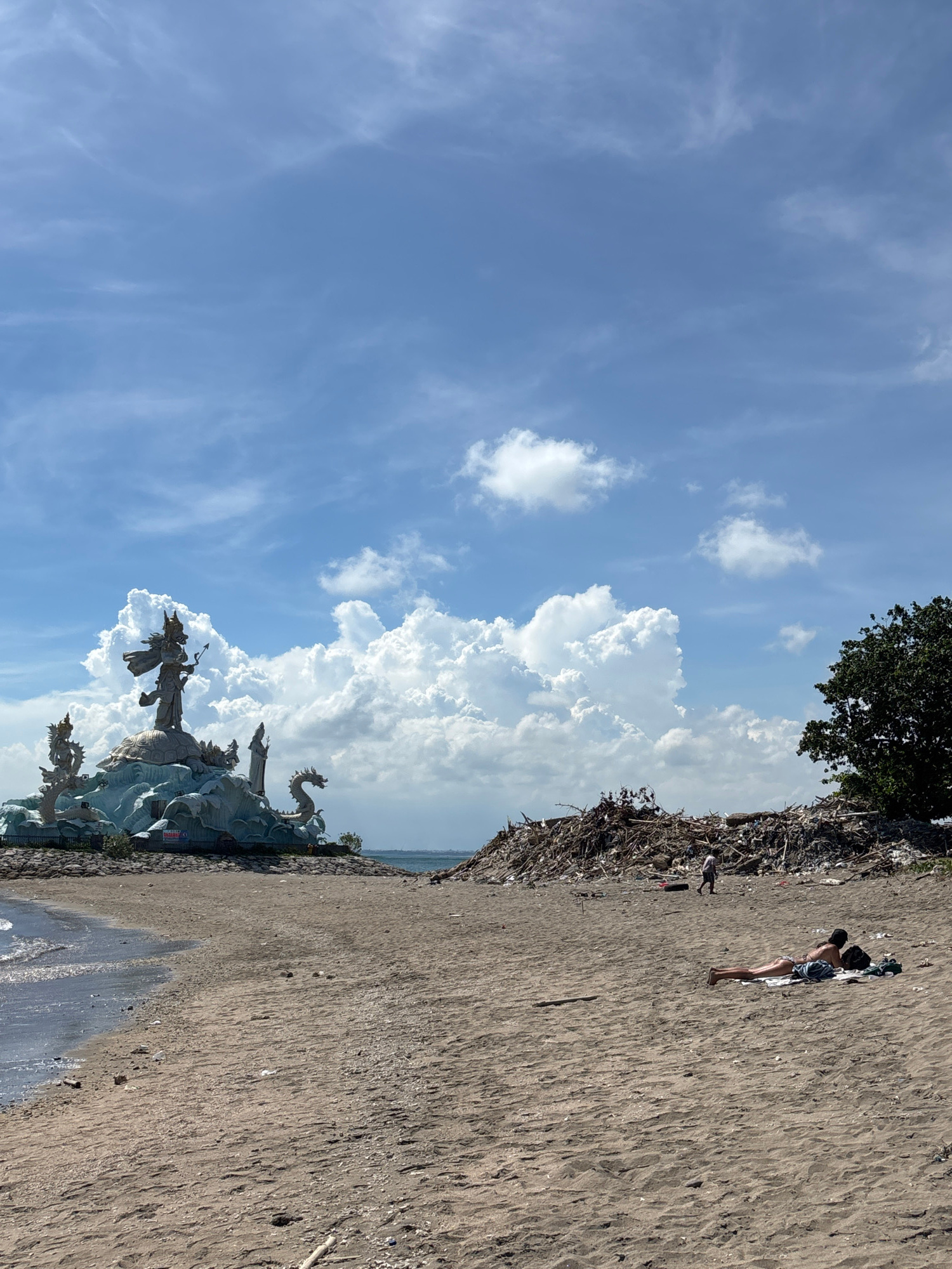 The image depicts a beach scene in Kuta, Indonesia. A large statue complex of Hindu deities rests near the shoreline, with sculpted dragons prominent. A fair-skinned person is standing on the beach, w…read more