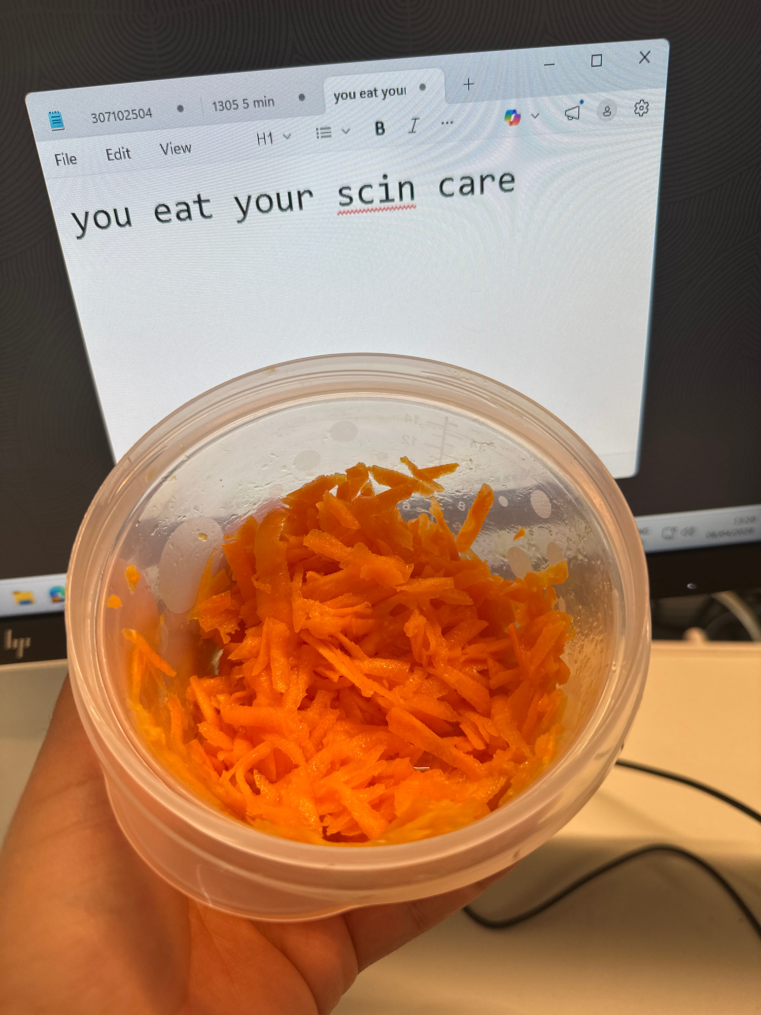 A human hand is holding a clear plastic container filled with shredded orange vegetables, possibly carrots. The container is positioned in front of a computer screen displaying a document with the tex…read more