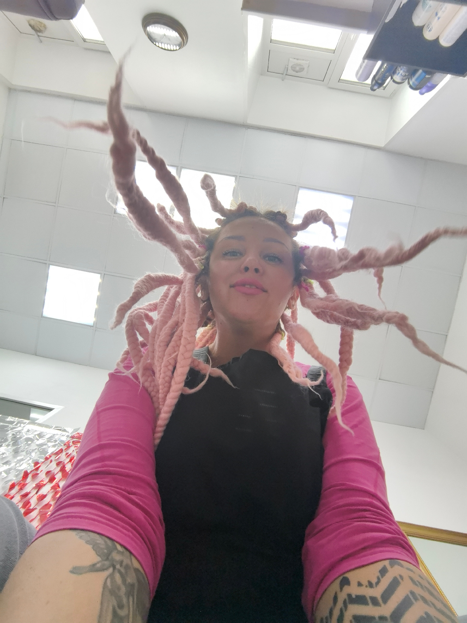 The image shows a person with pink hair in a room with white walls and a white ceiling. The ceiling has recessed lighting and a rectangular skylight. The person is wearing a black top with pink sleeve…read more
