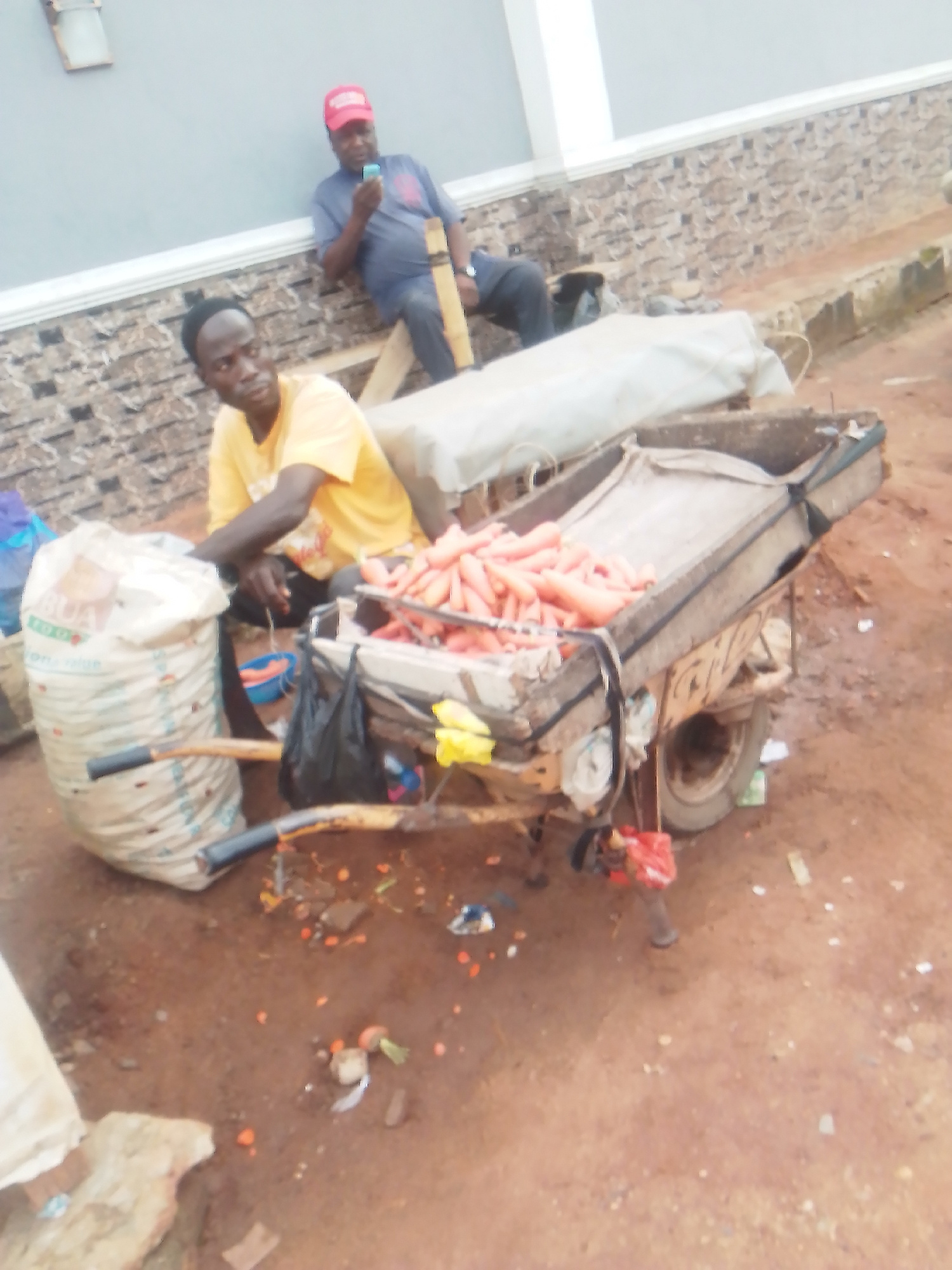 A vendor sits near a cart loaded with carrots on a dirt road. Beside the cart is a large sack. Behind the vendor, another man in a red cap is sitting and looking at a phone. The location is Unknown, U…read more