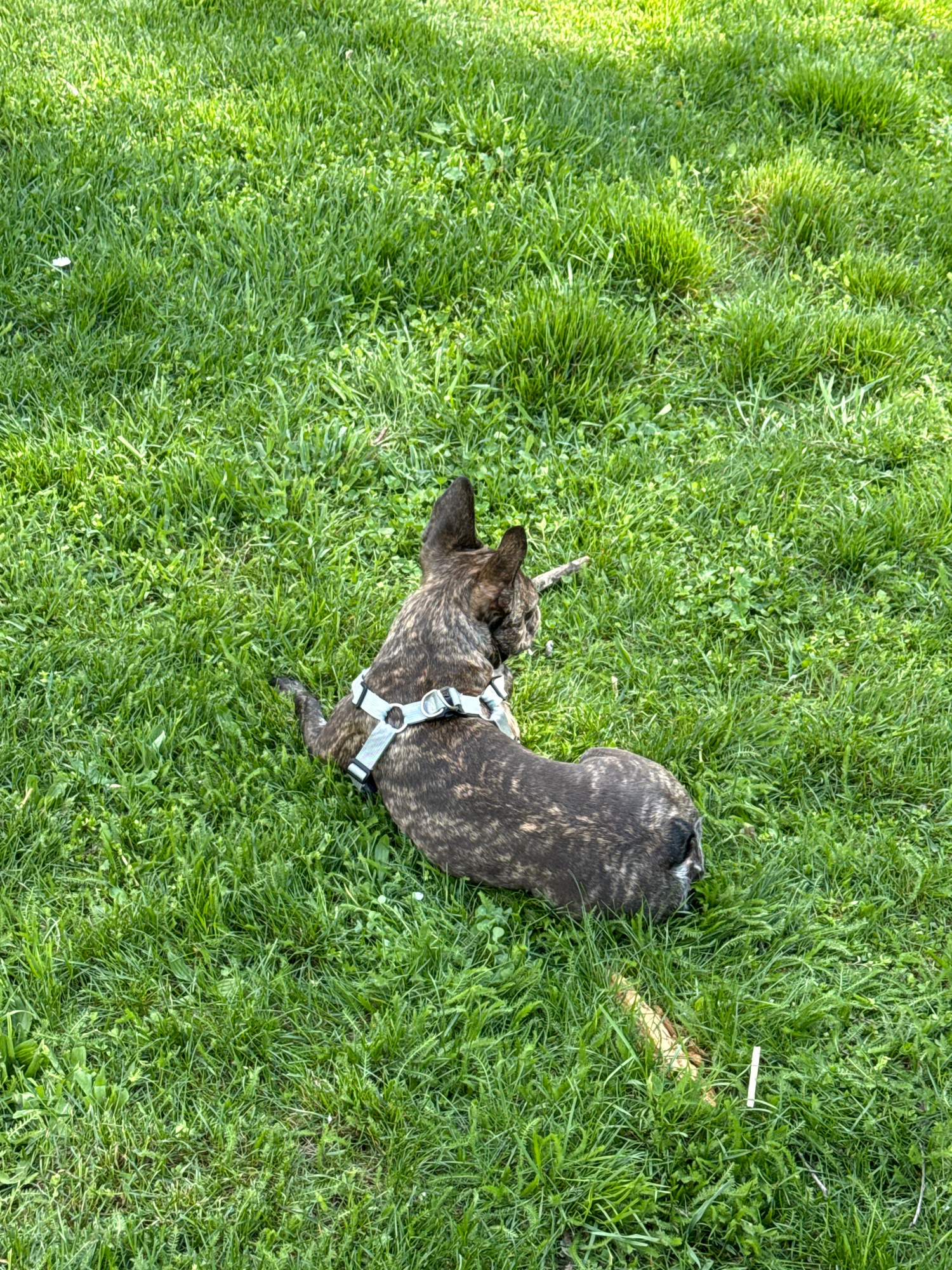 A dog lies on green grass. The dog is brindle colored and wearing a light blue harness. The dog is facing left and slightly towards the bottom of the frame. A small stick lies near the dog's head. A s…read more